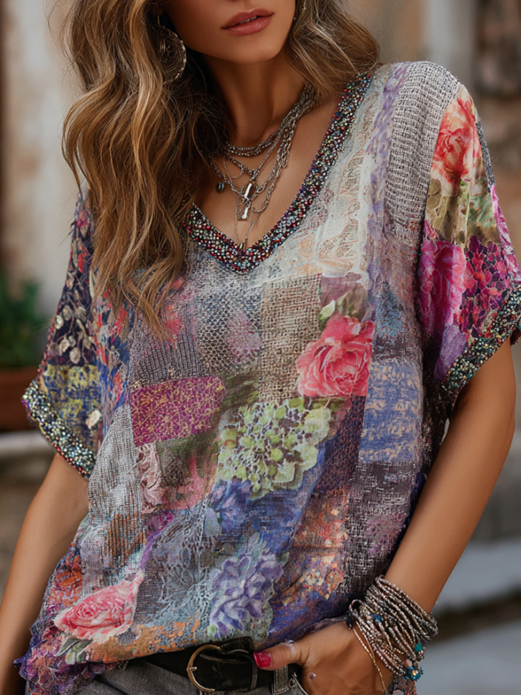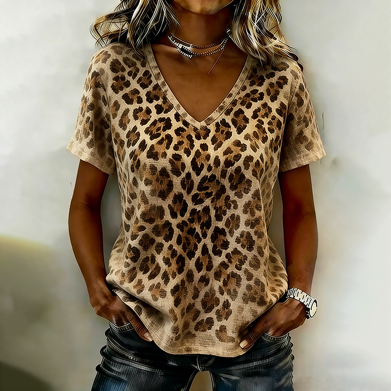 Vintage Leopard And Animal Patchwork Art Pattern Linen Blend Loose Short Sleeve Tops