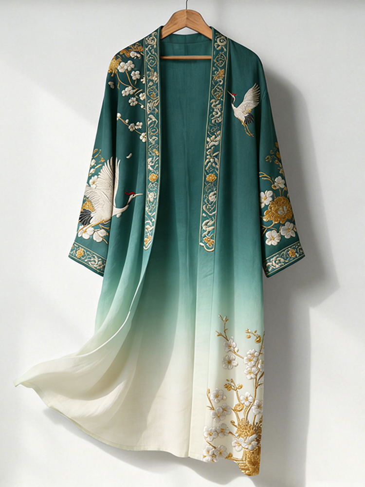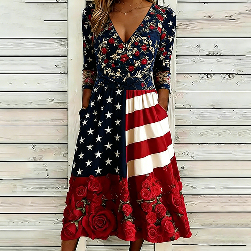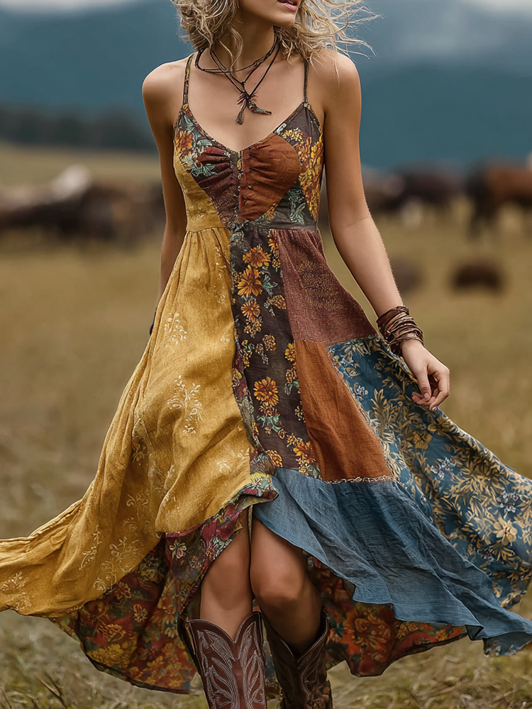 Vintage Colorful Sun Collage Art Pattern Linen Blend V-neck Loose Long Sleeve Midi Dress