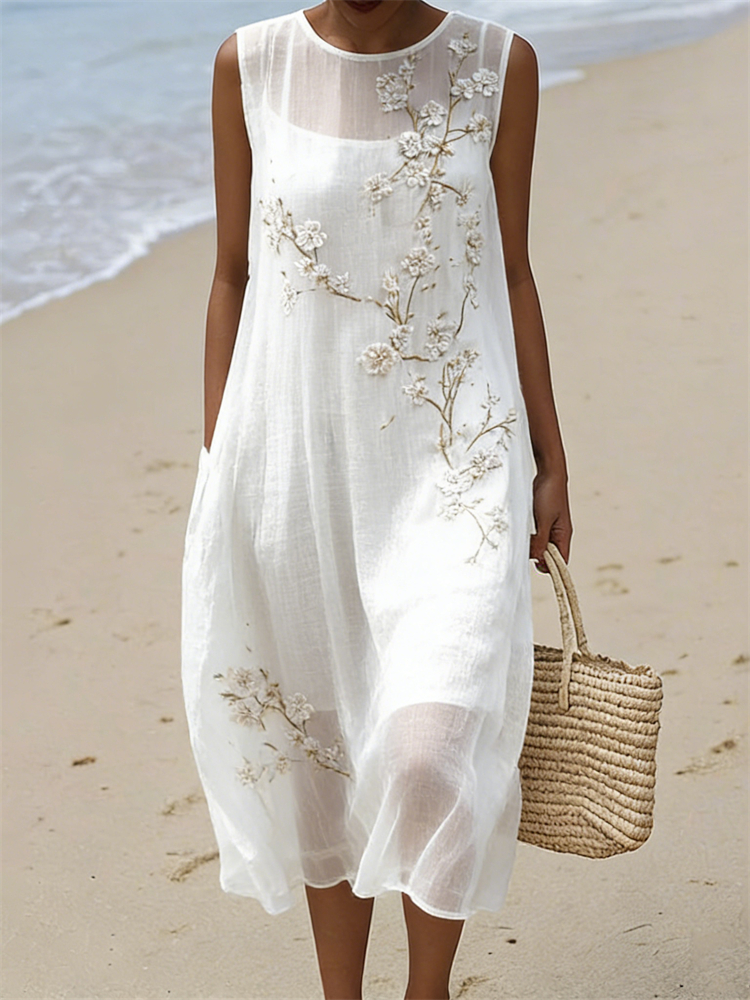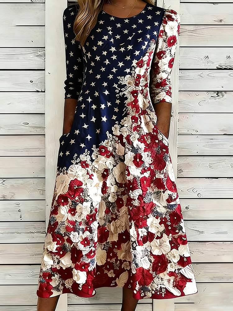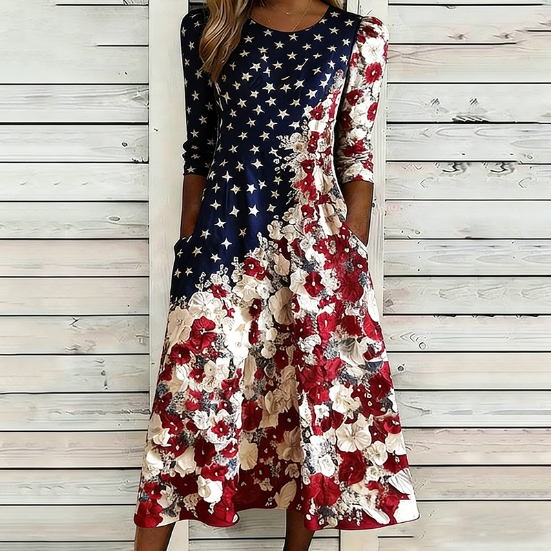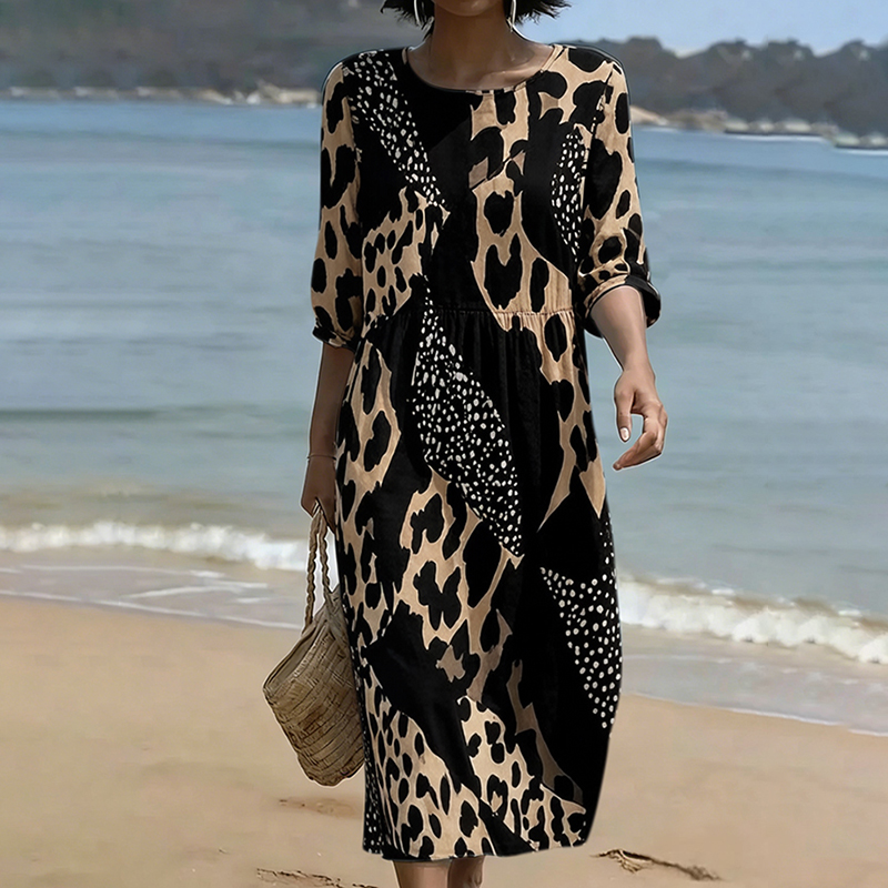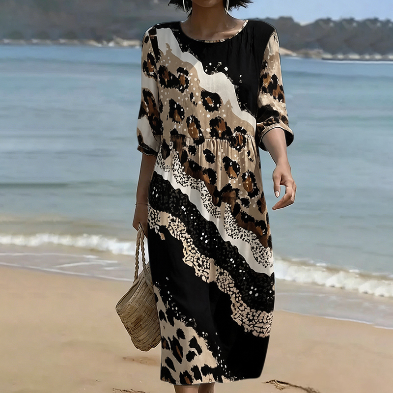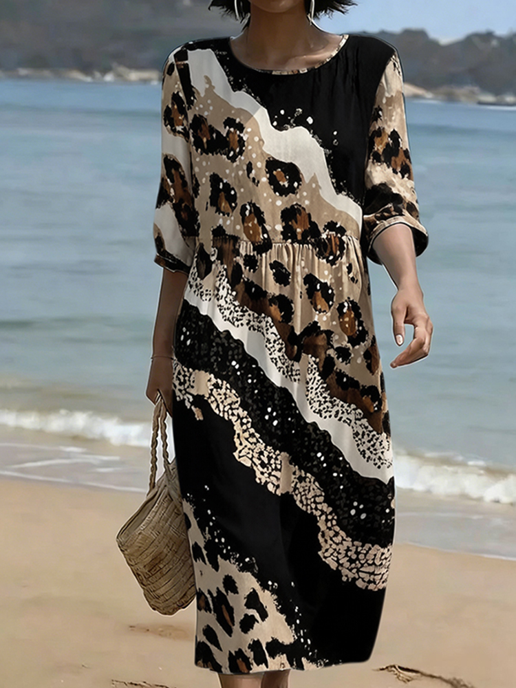 Retro Leopard And Animal Patchwork Art Linen Blend Loose Three-quarter Sleeve Dress