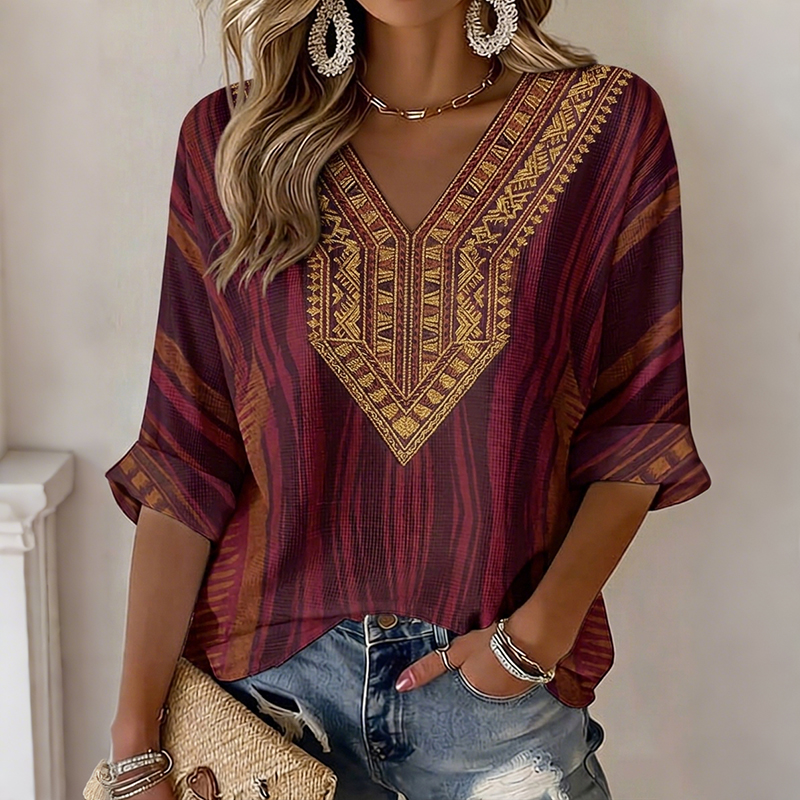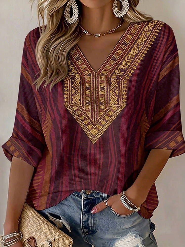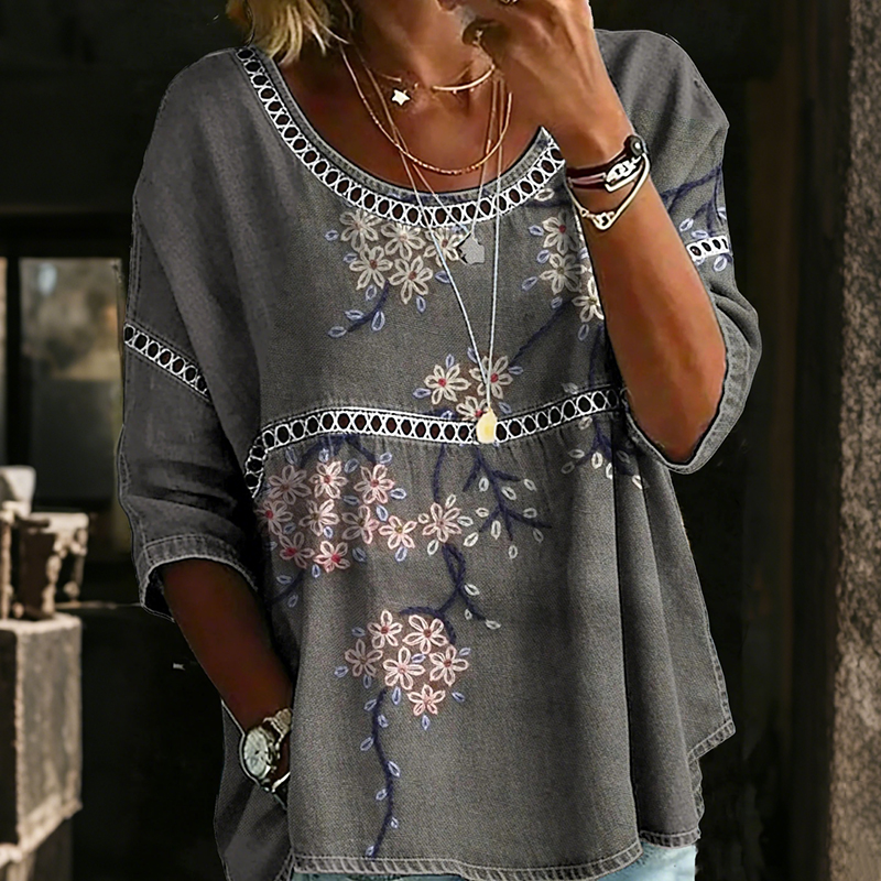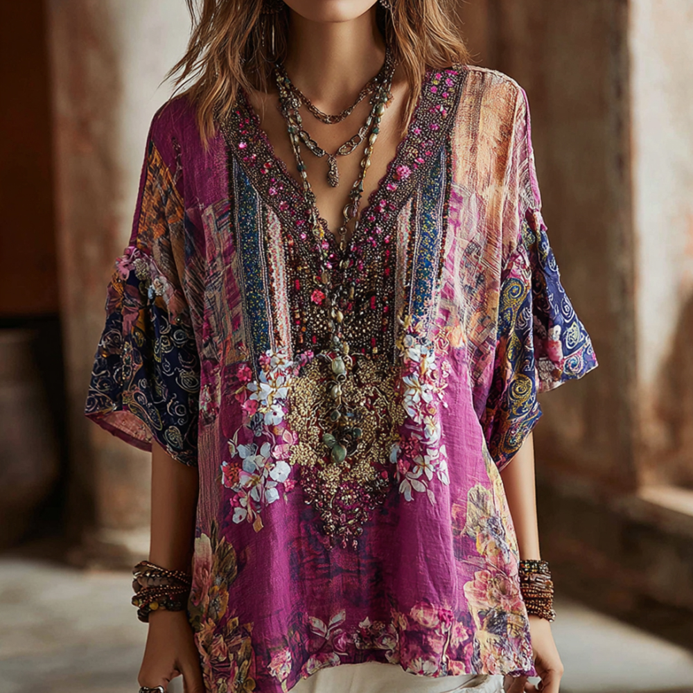 Women's Vintage Floral In Gradient Art Print Flowy Linen Blend Three-quarter Sleeve V Neck Linen Tops