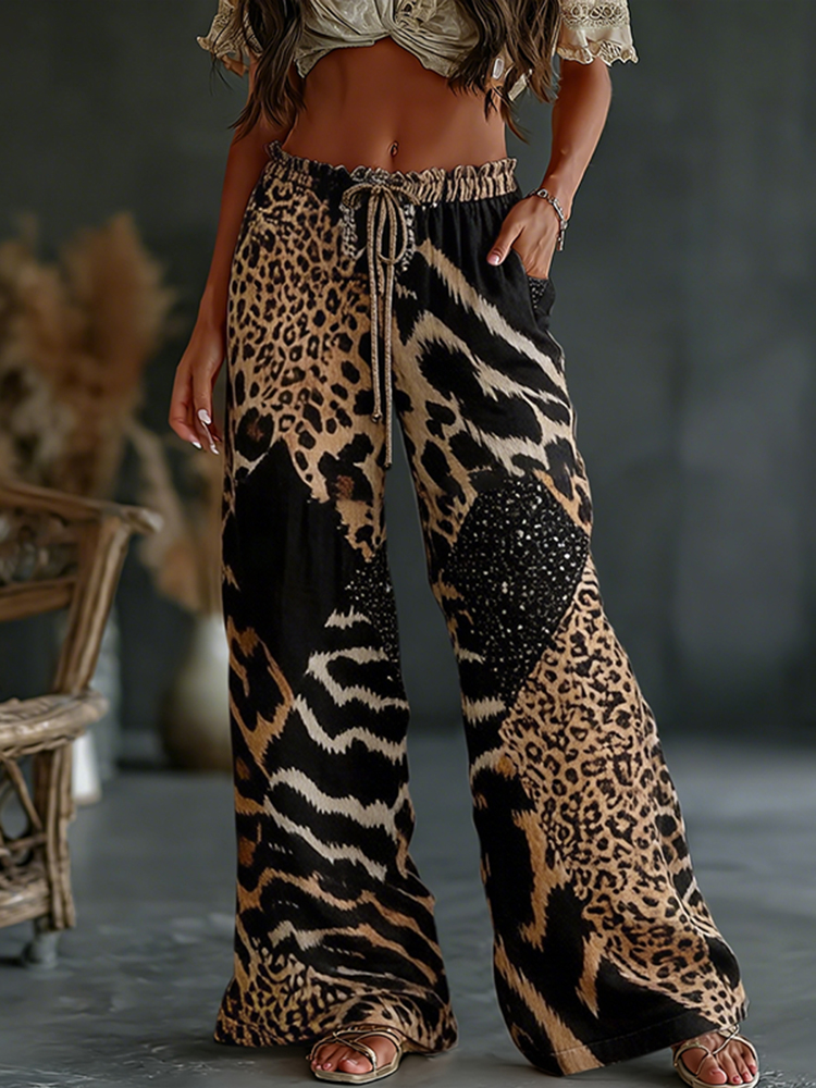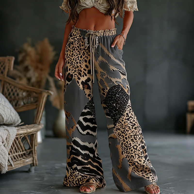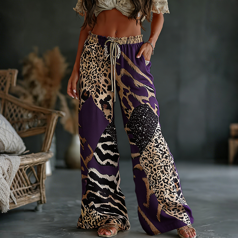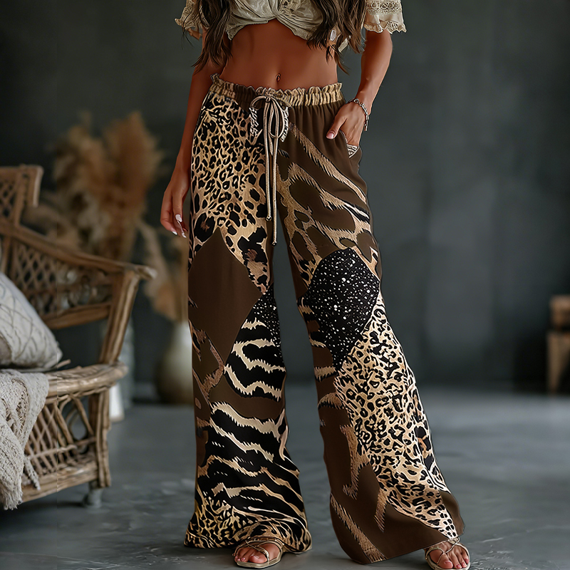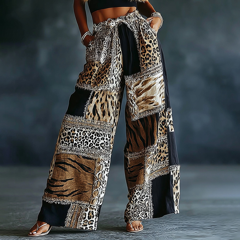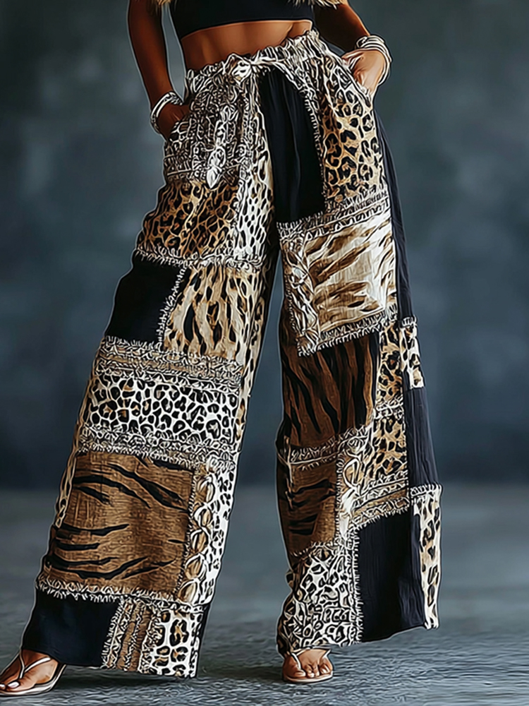 Women's Vintage Leopard And Animal Patchwork Art Print Flowy Linen Blend Casual Pants