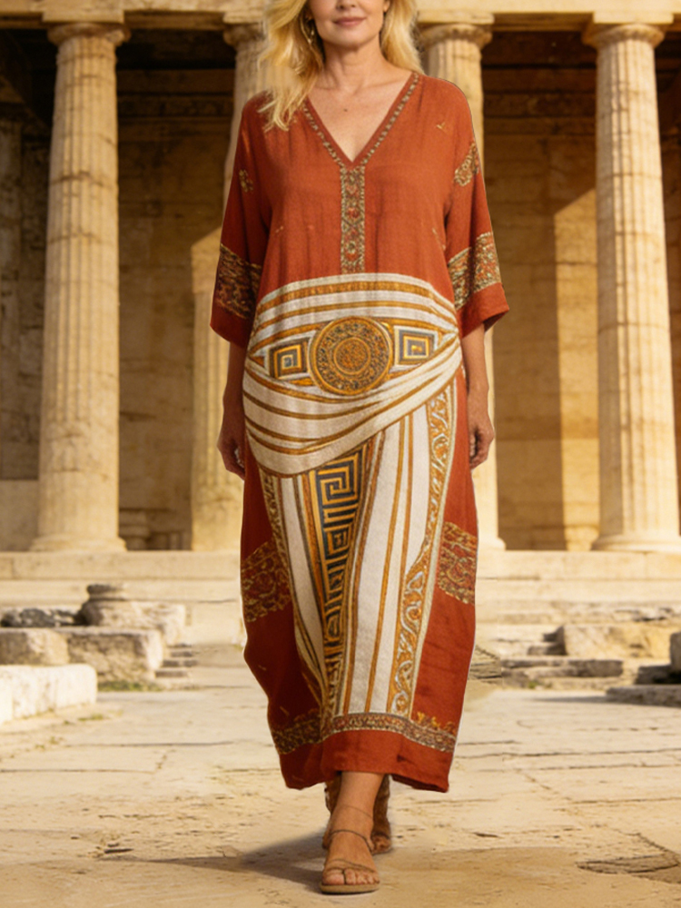 Greek Pattern Vintage Women's Linen V-neck Maxi Dress