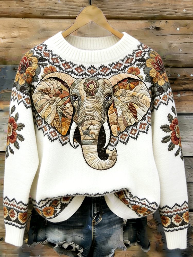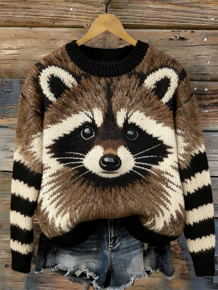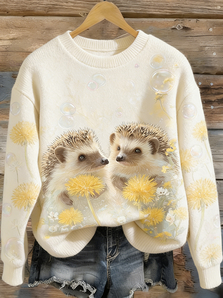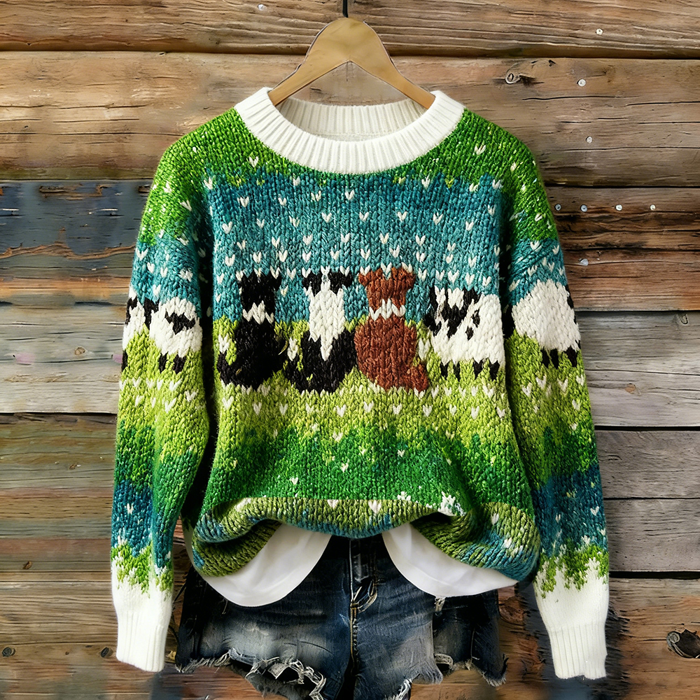 Cute Cat Heart And Floral Pattern Comfortable Round Neck Sweater For Women