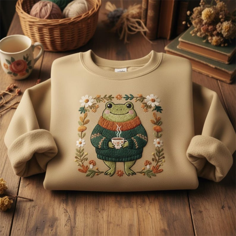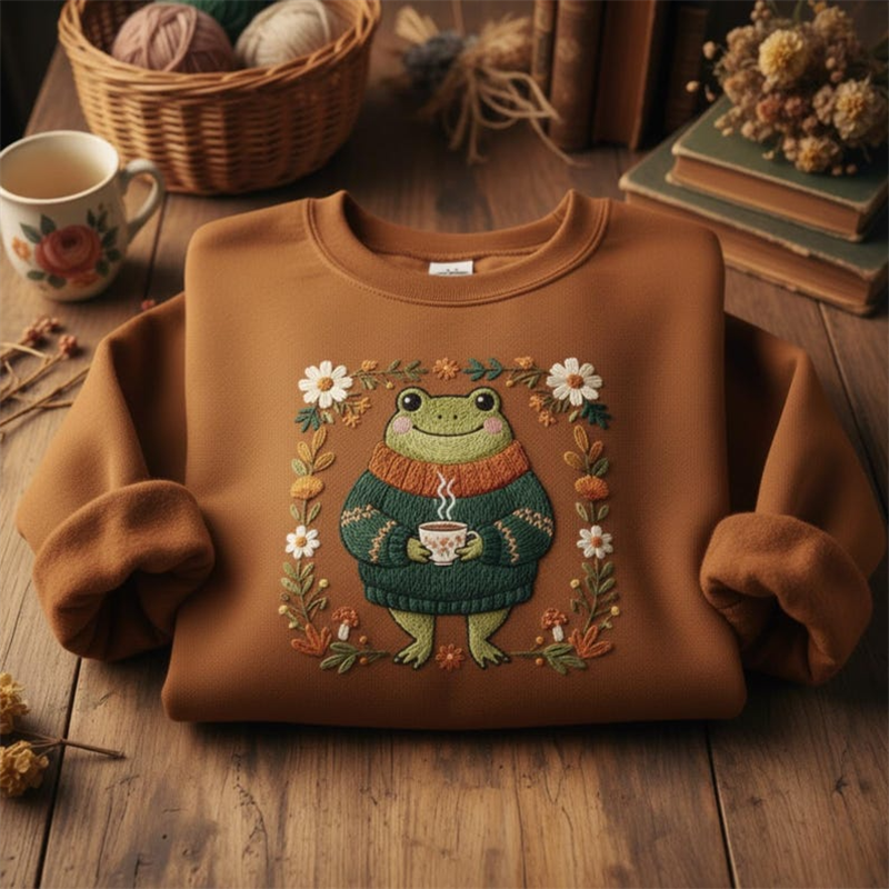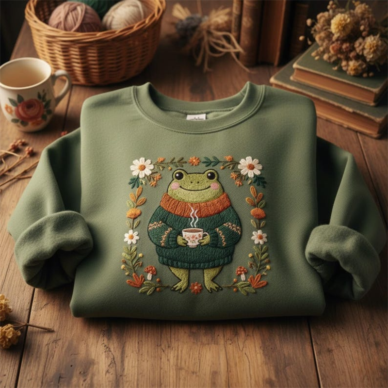 Cozy Frog With Tea Embroidered Shirt Cottagecore Folk Art Sweatshirt