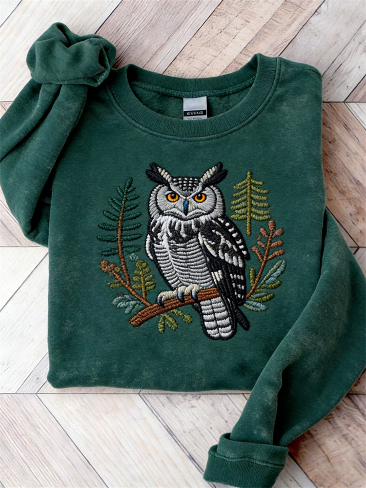 Lovely Owl & Forest Plants Inspired Washed Sweatshirt