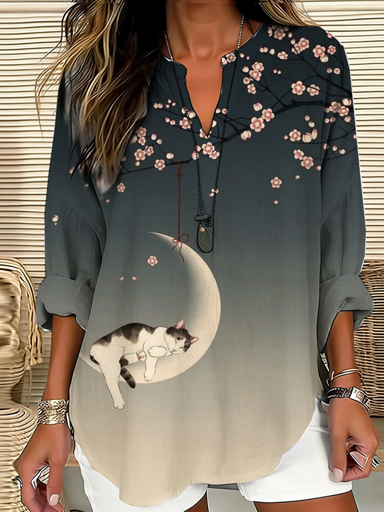 Japanese Moon Kitty V-neck Cotton And Linen Top