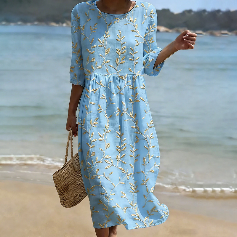 Vintage Floral Art Pattern Linen Blend Loose Three-quarter Sleeve Dress