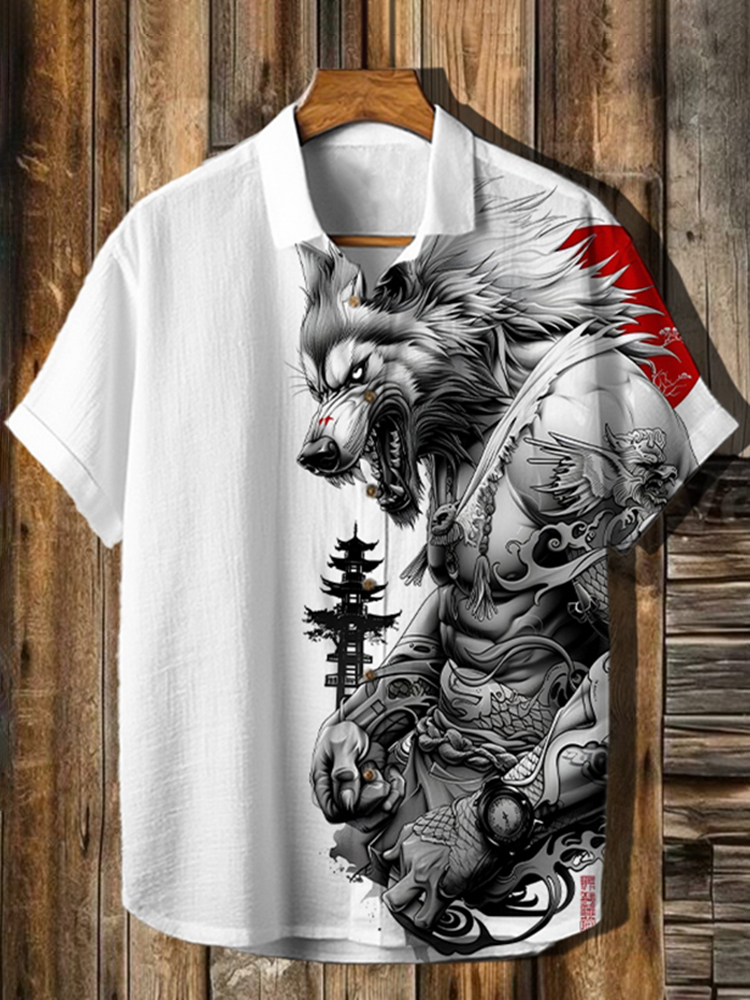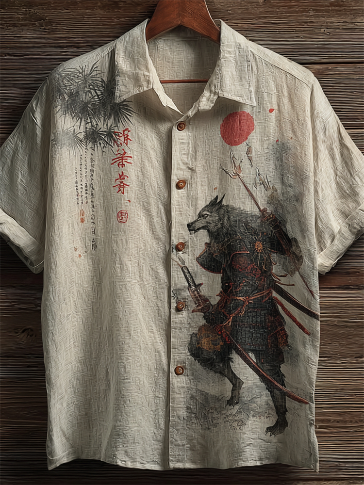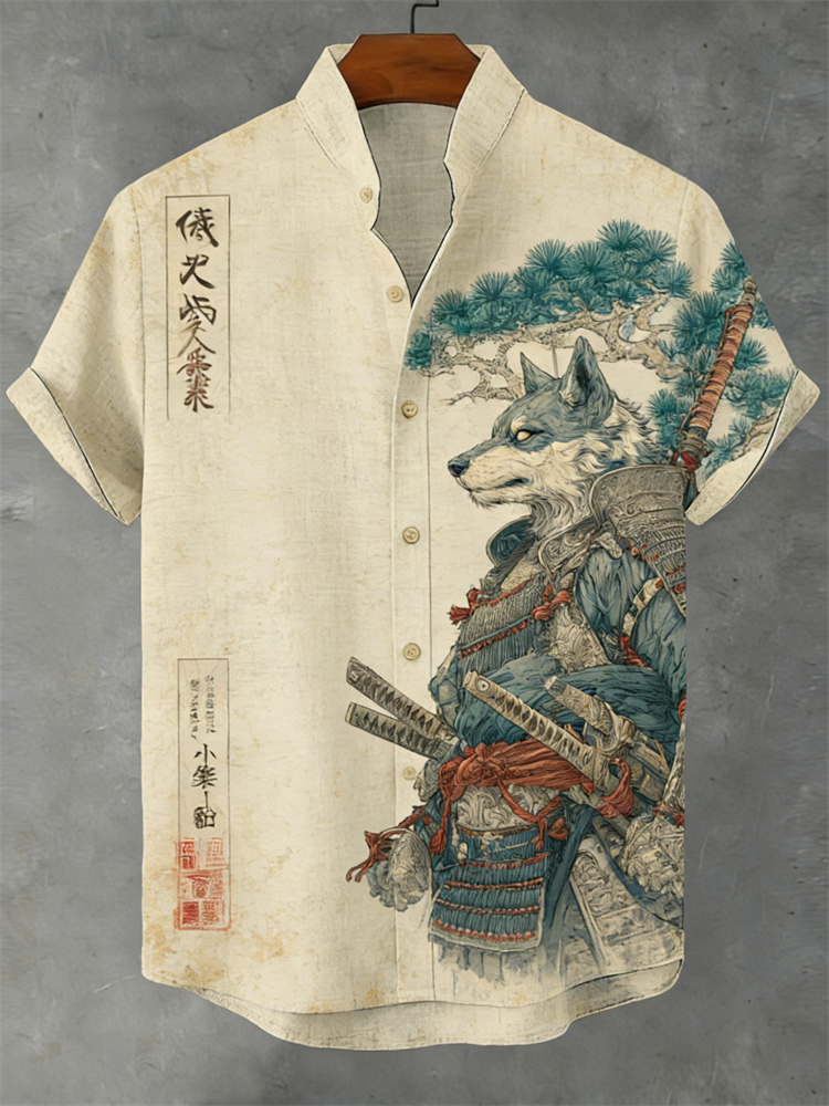 Japanese Wolf Samurai & Pine Trees Linen Shirt