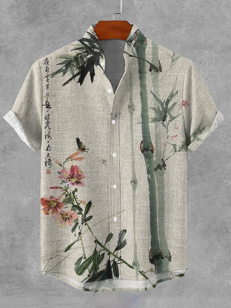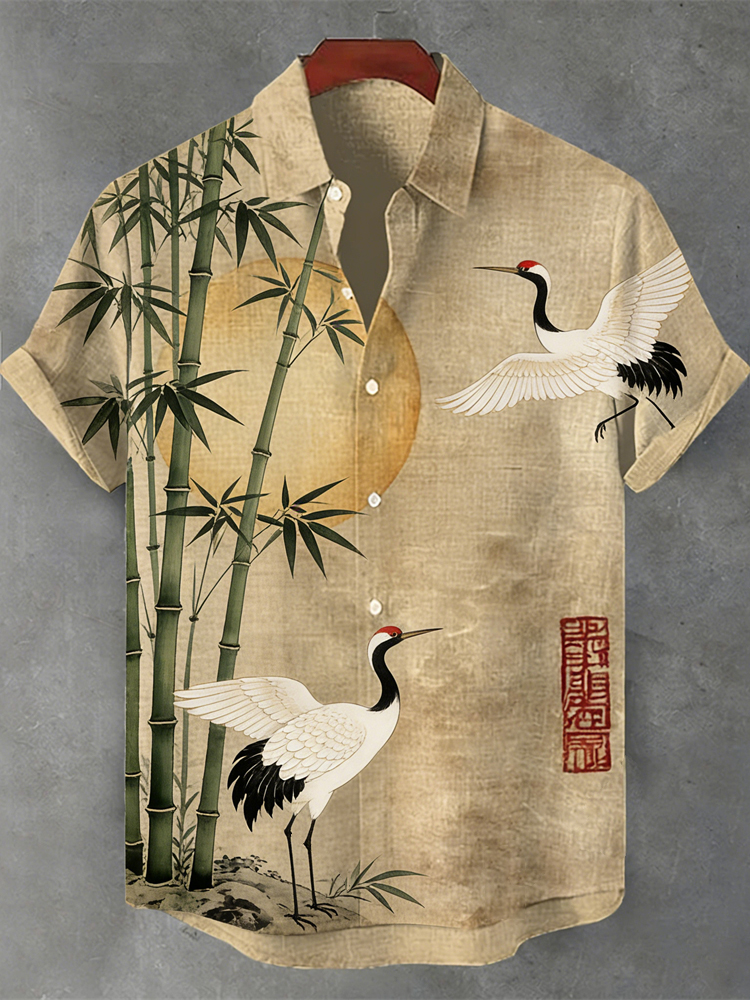 Vintage Bamboo Crane Pattern Men's Linen Short Sleeve Shirt