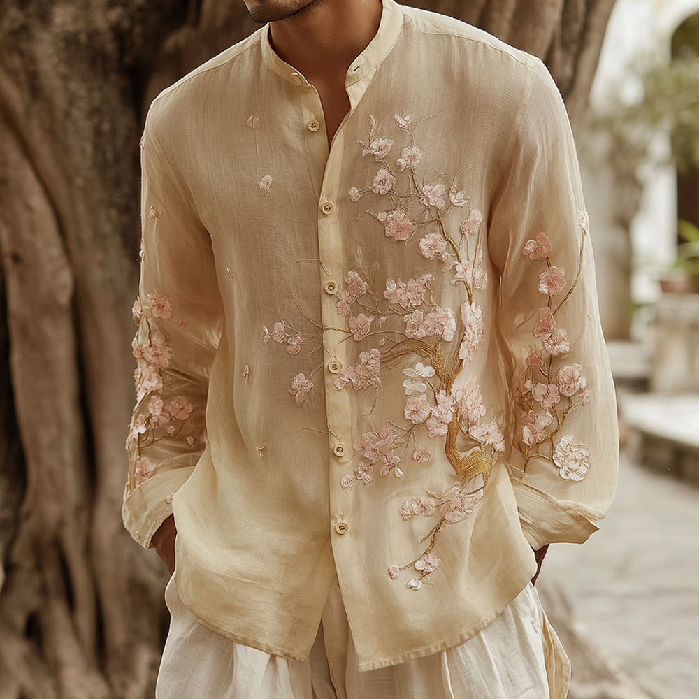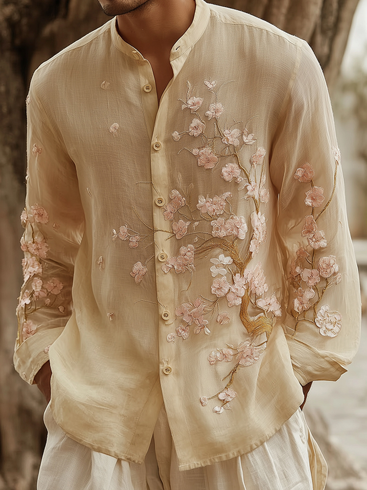 Men's Apricot Blossom With Bird Embroidery Painting Art Linen Shirt