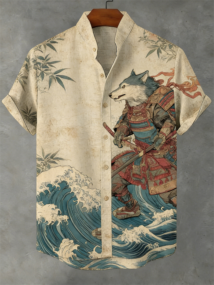 Japanese Wolf Samurai Sea Waves Linen Shirt