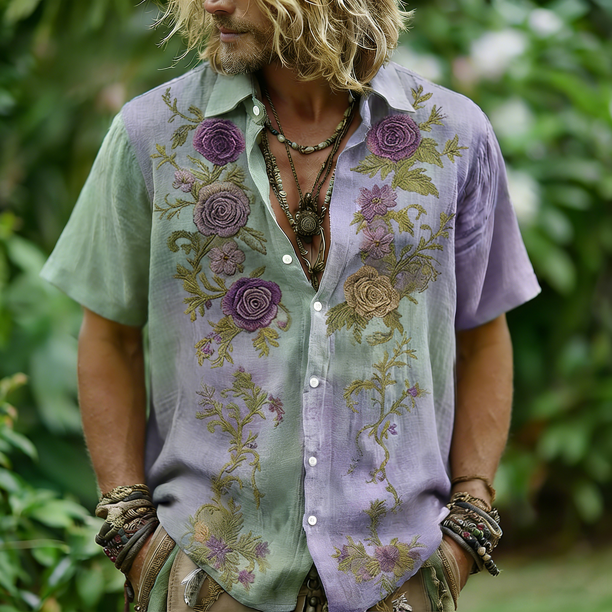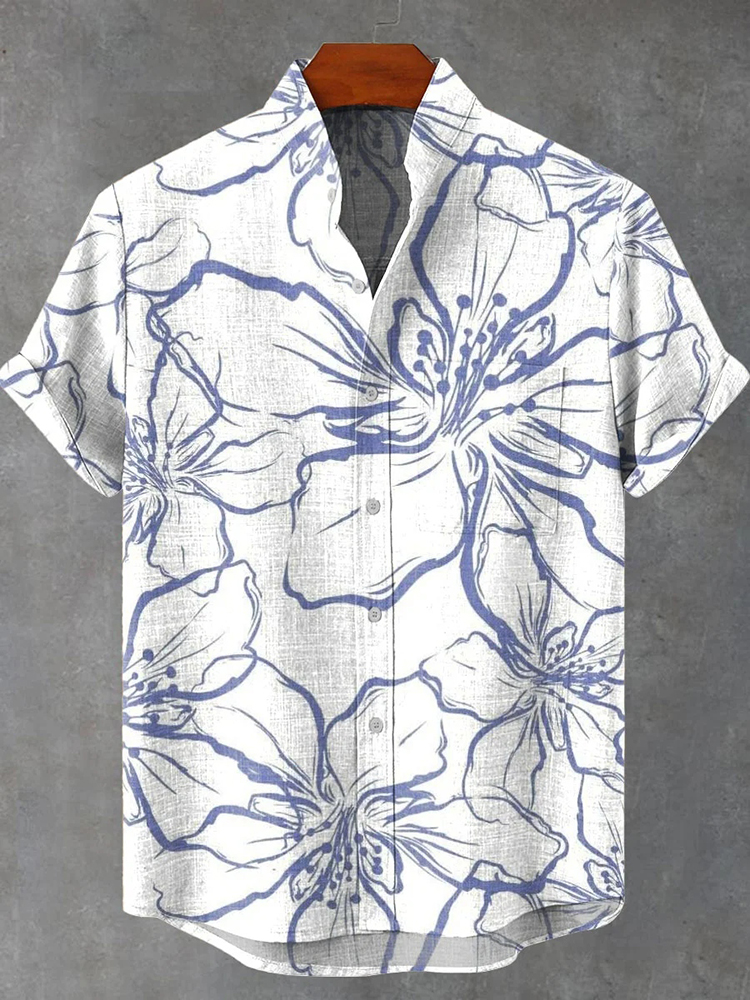 Men's Vintage Floral Embroidered Comfy Linen Blend Cozy Short Sleeve Shirt