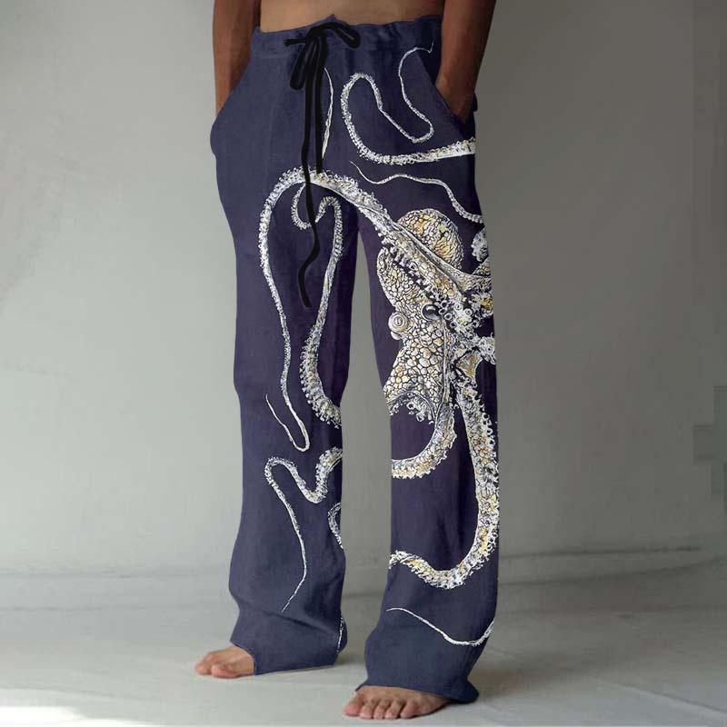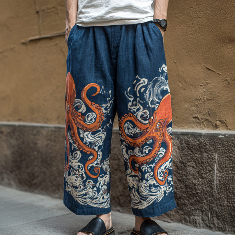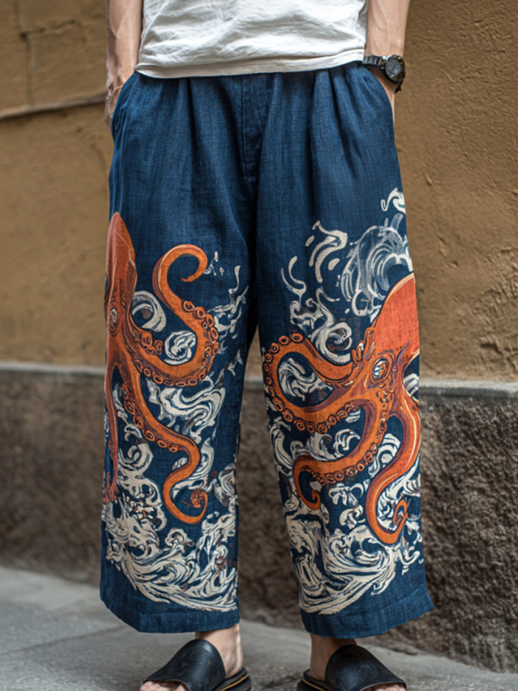 Men's Retro Japanese Art Ocean Octopus Print Casual Pants