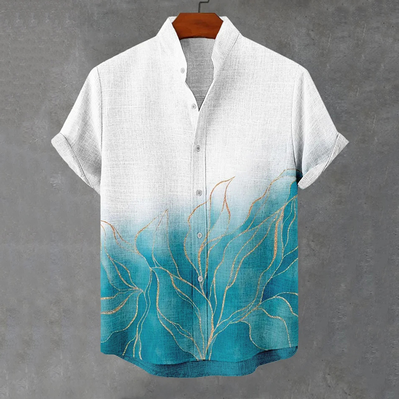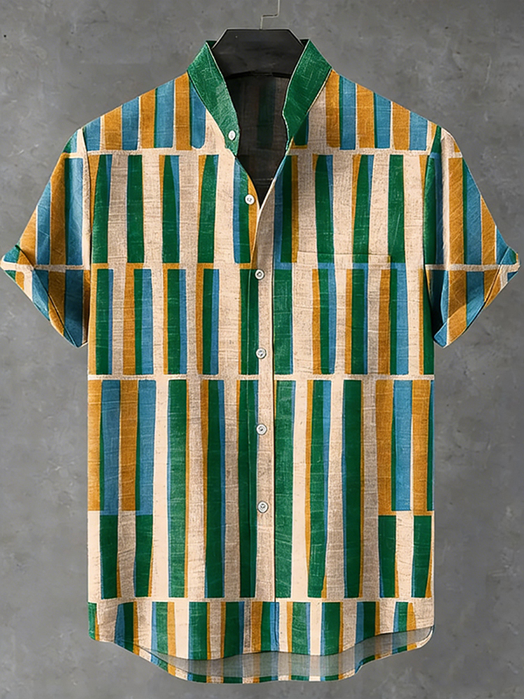 Men's Stripe Printed Art Short Sleeve Linen Blend Shirt