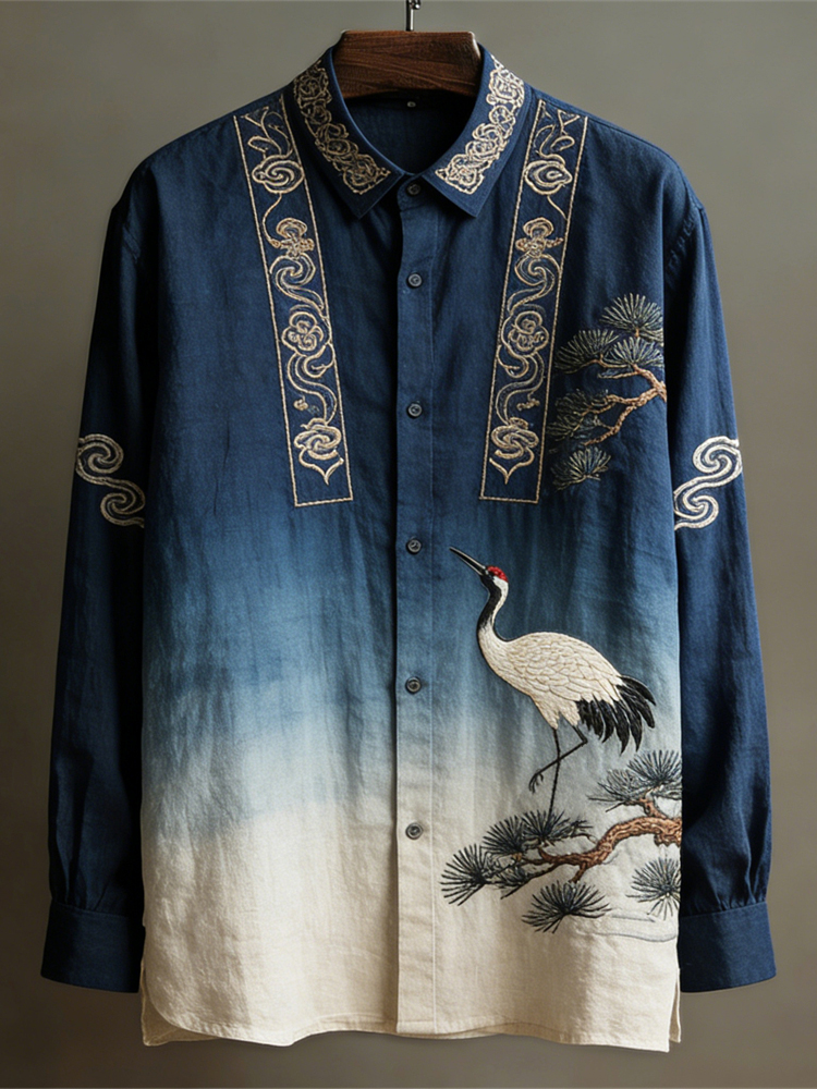 Japanese Crane Vintage Men's Linen Long Sleeve Shirt