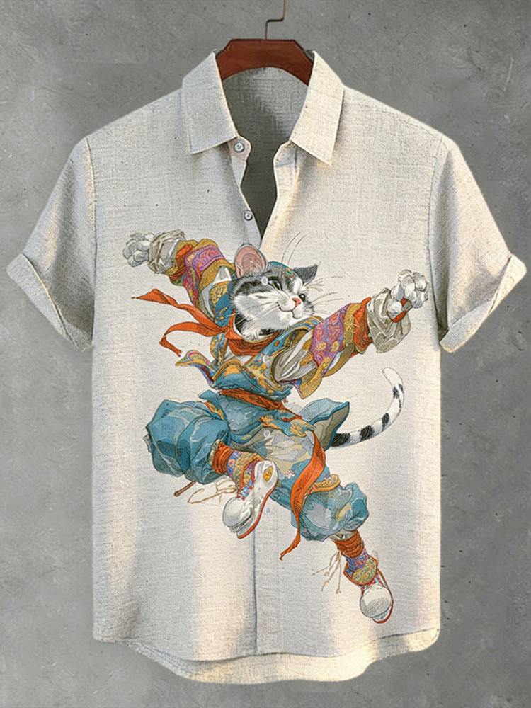 Men's Japanese-style Artistic Cat Print Short-sleeved Shirt
