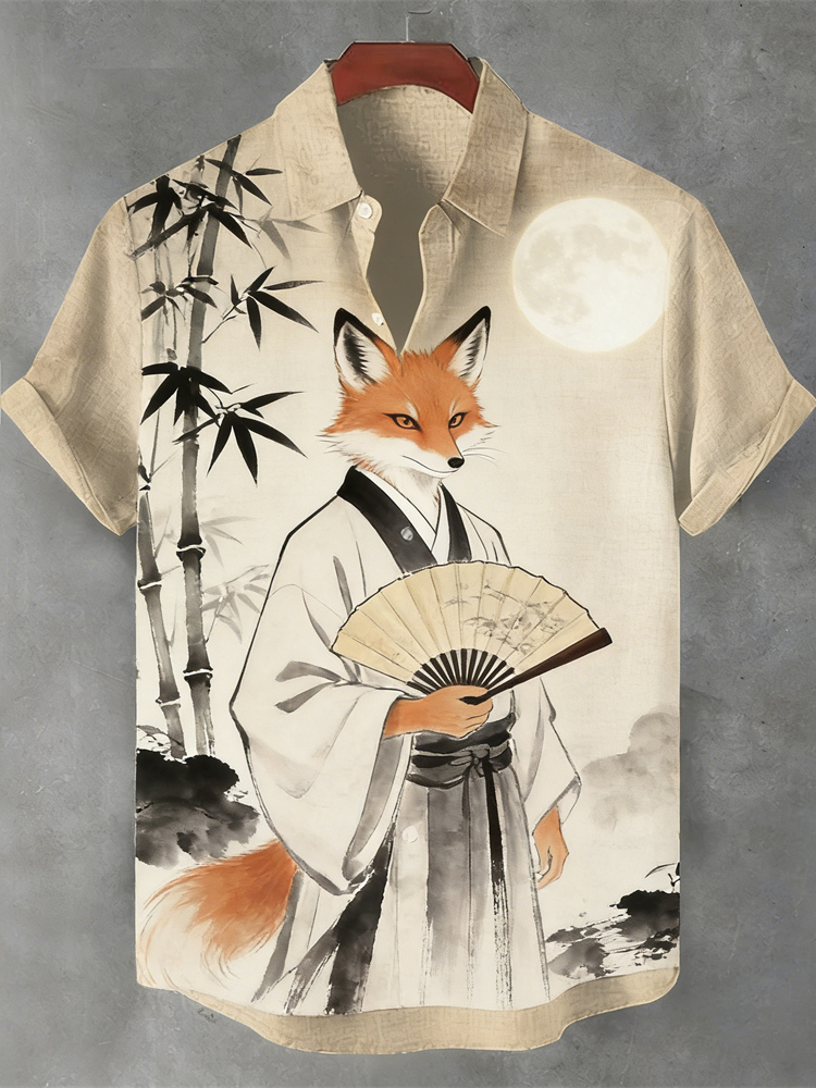 Japanese Fox Pattern Vintage Men's Linen Short Sleeve Shirt