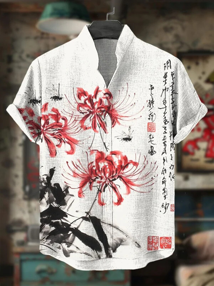 Men's Red Spider Lily Calligraphy Ink Painting Art Print Casual Shirt