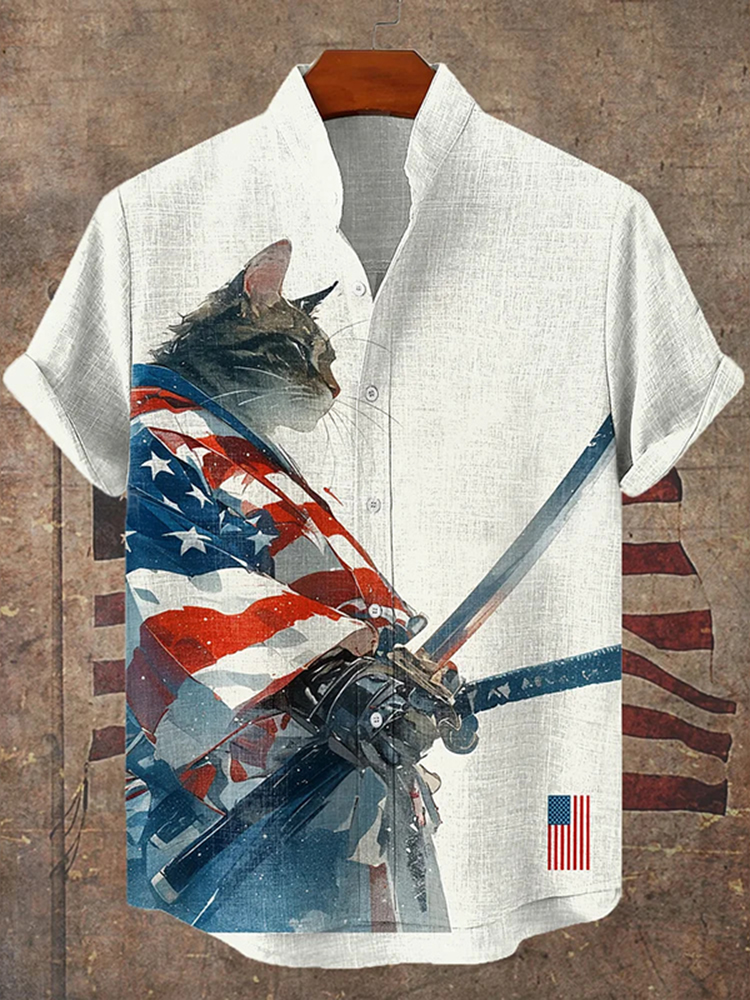 Men's American Flag Robe Cat Ink Painting Short Sleeve Linen Blend Shirt
