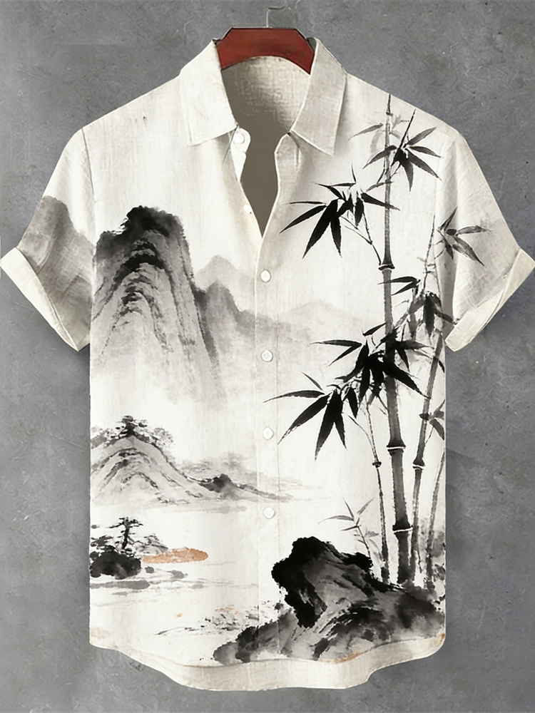 Japanese Ink Landscape Pattern Men's Linen Short Sleeve Shirt