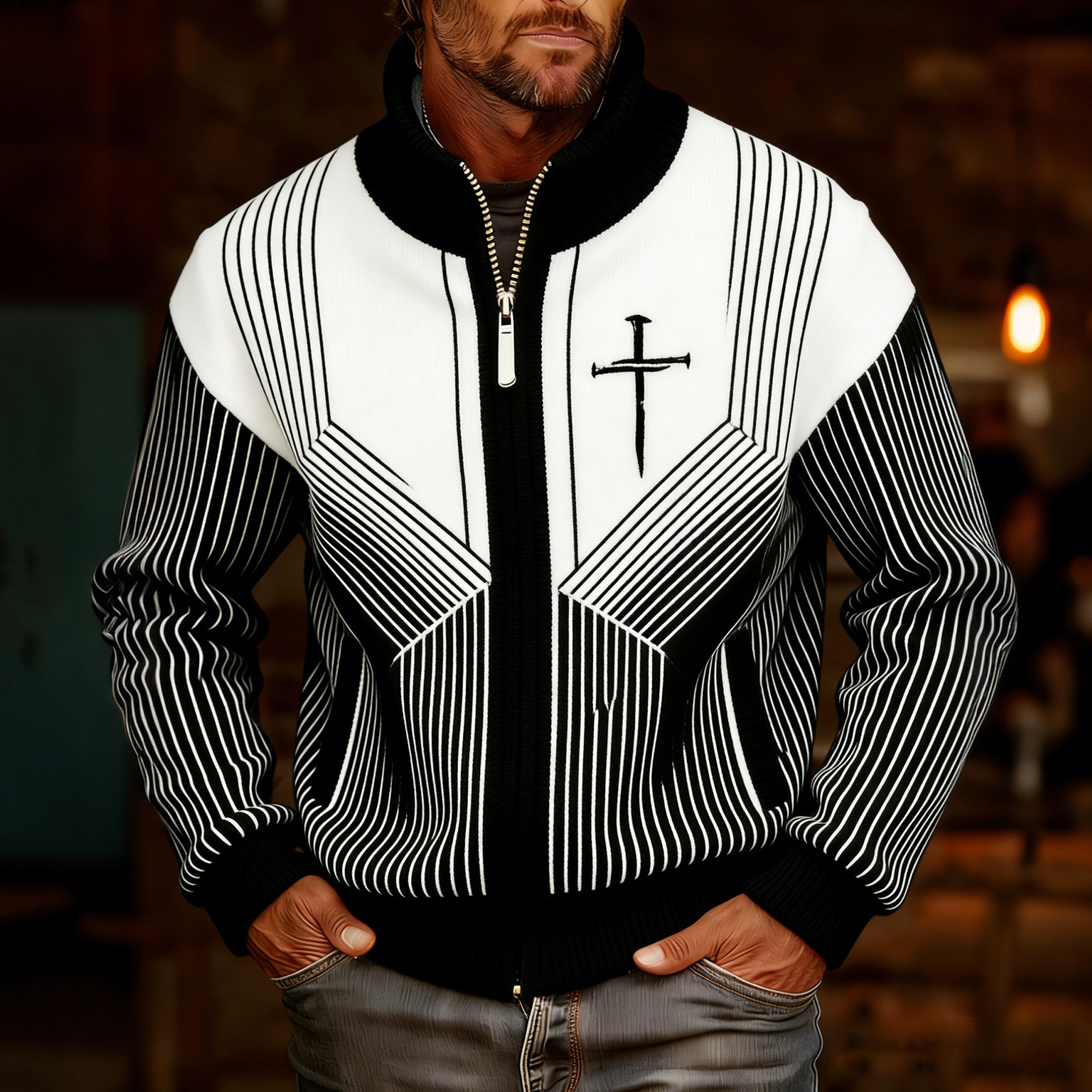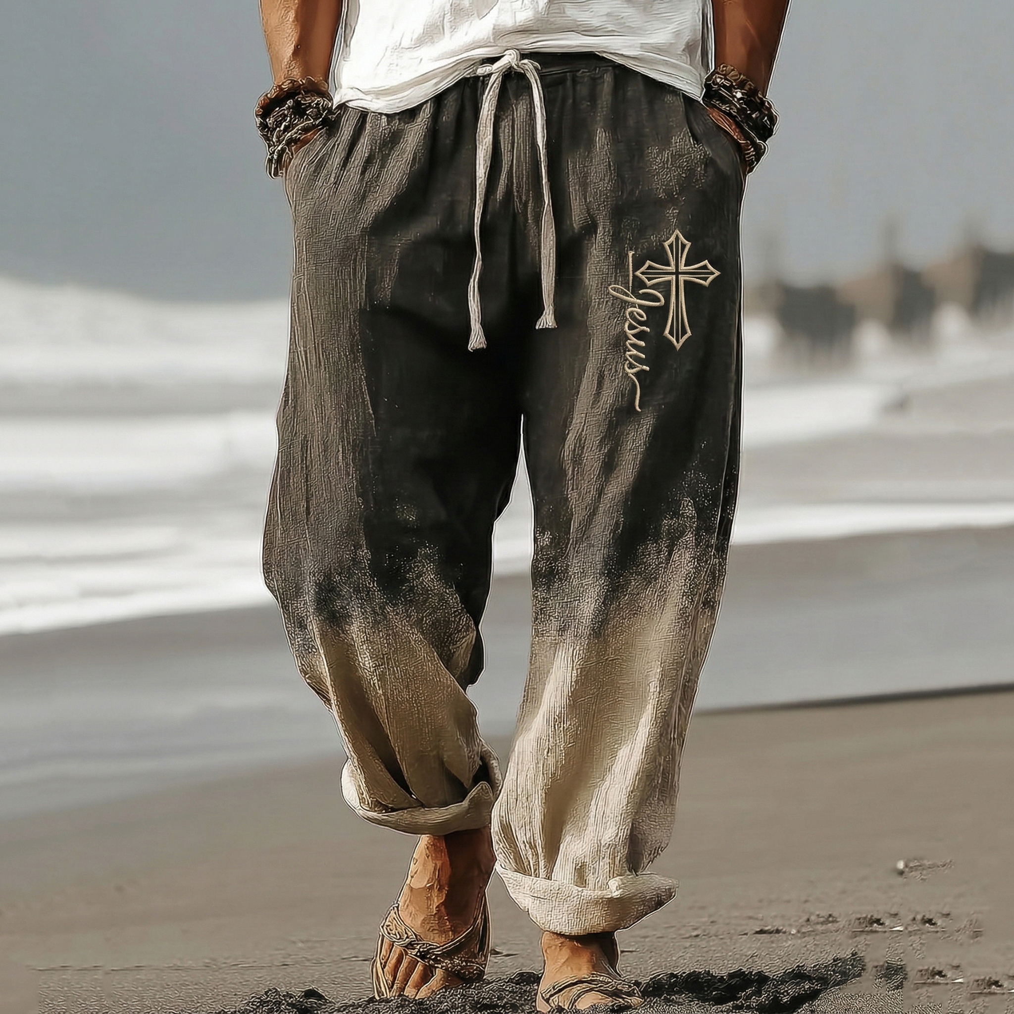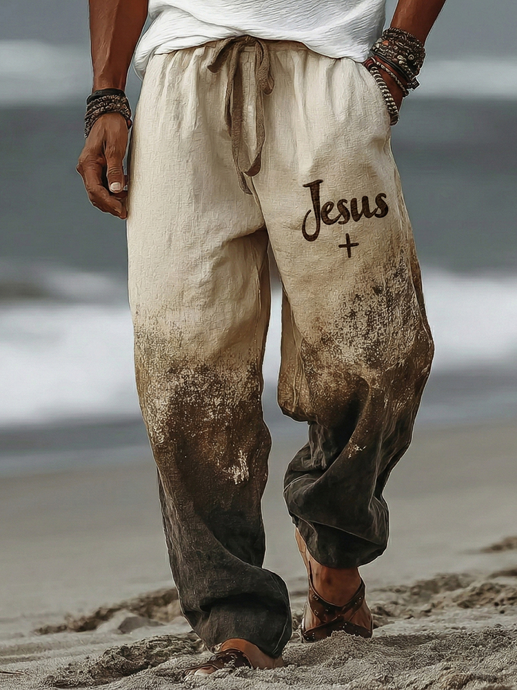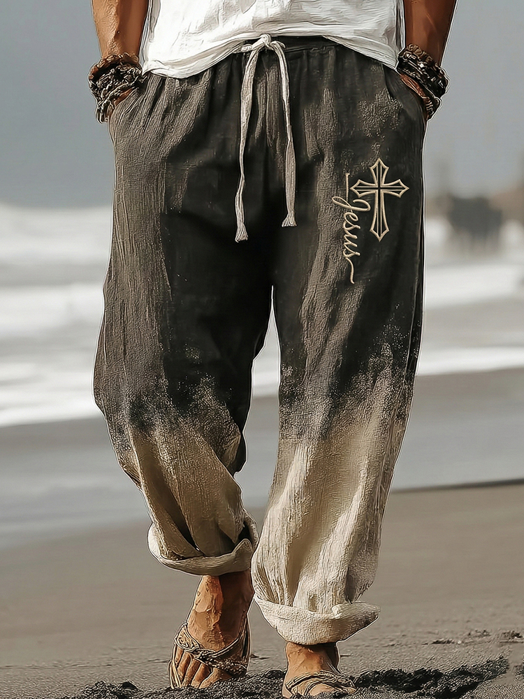 Men's Vintage Faith Cross With Jesus In Gradient Art Loose And Comfortable Cotton And Linen Pants