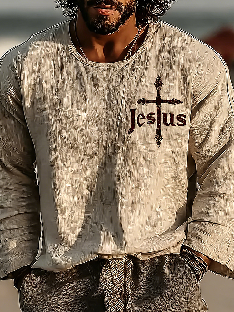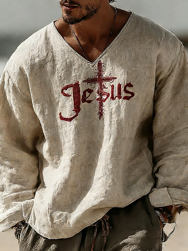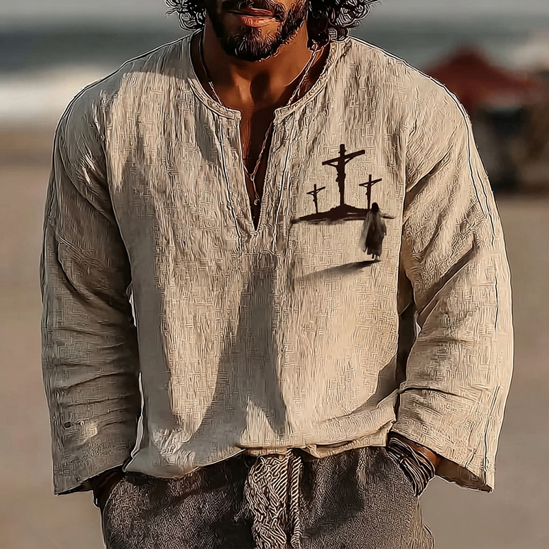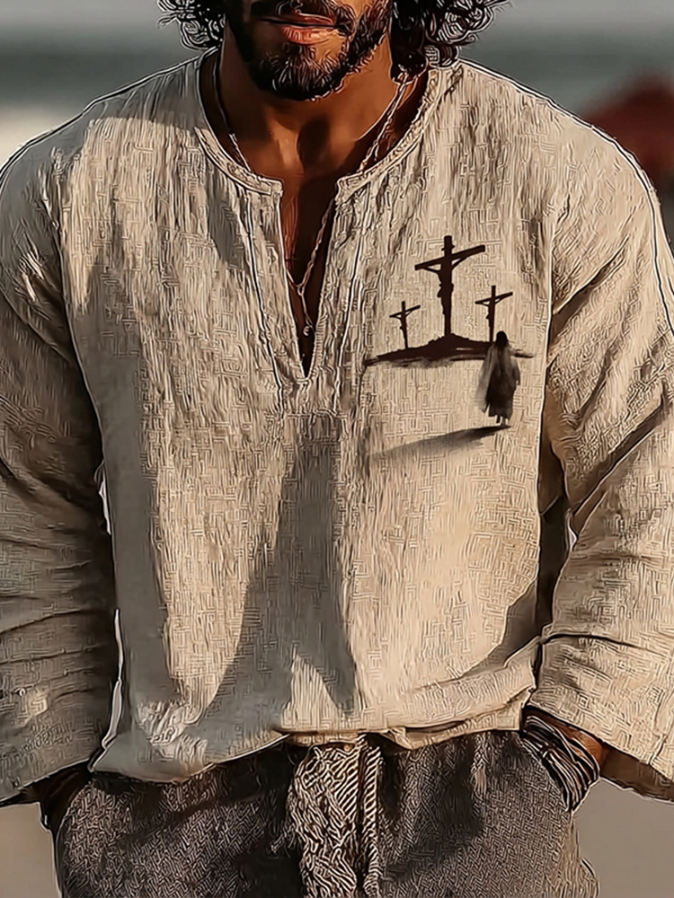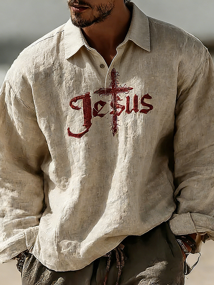Men's Vintage Cross Faith With Jesus Art Loose And Comfortable Cotton And Linen Long-sleeved Shirt