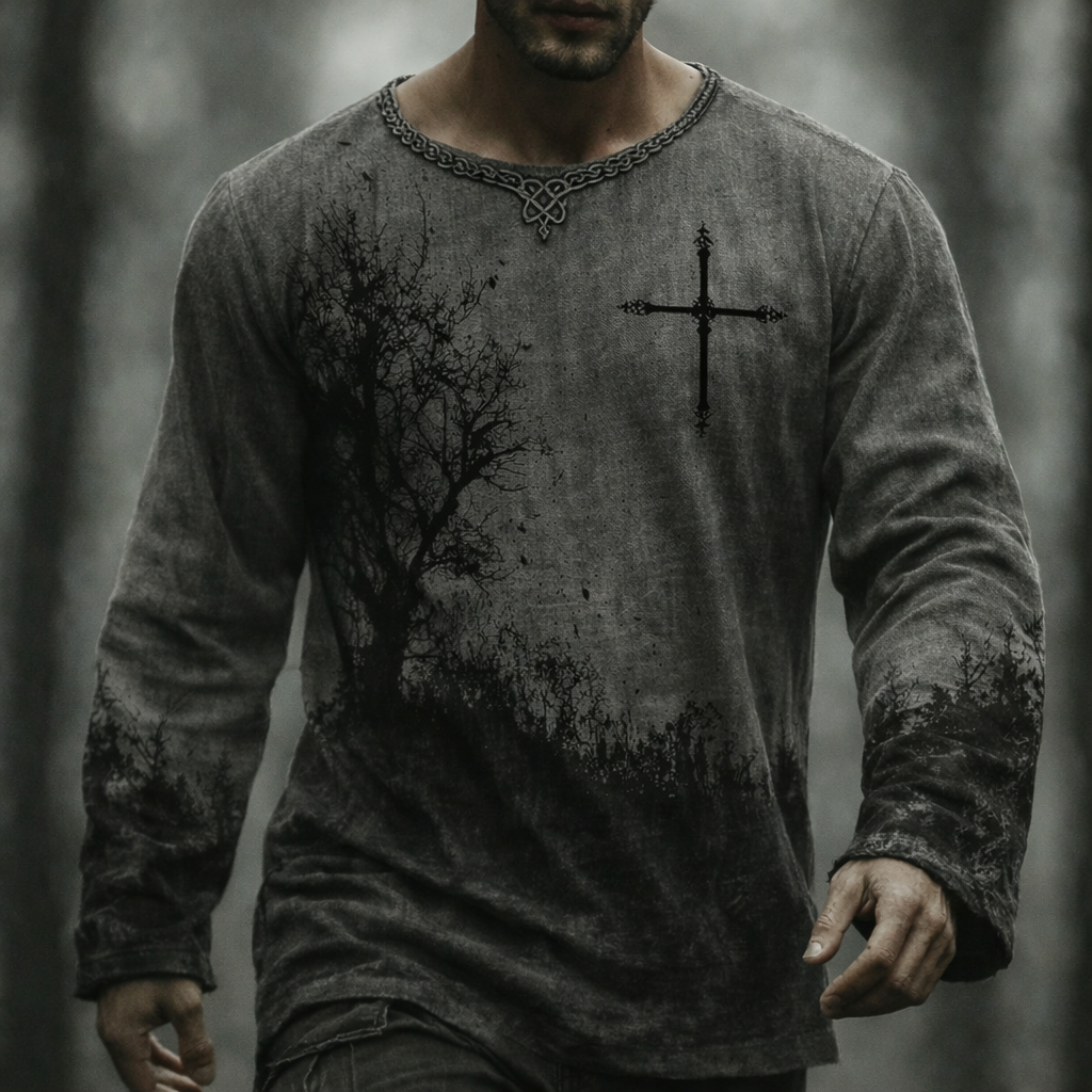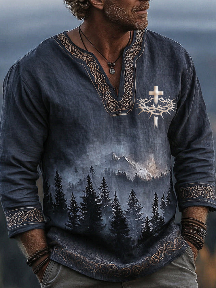 Men's Vintage Cross Faith And Celtic Knot In Forest Art Loose And Comfortable Cotton And Linen Long-sleeved Shirt
