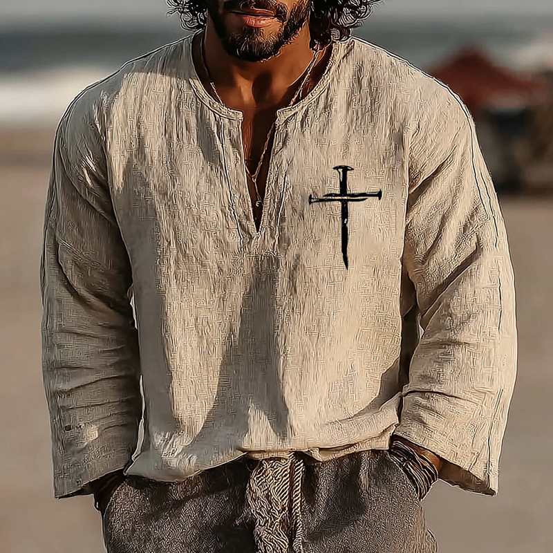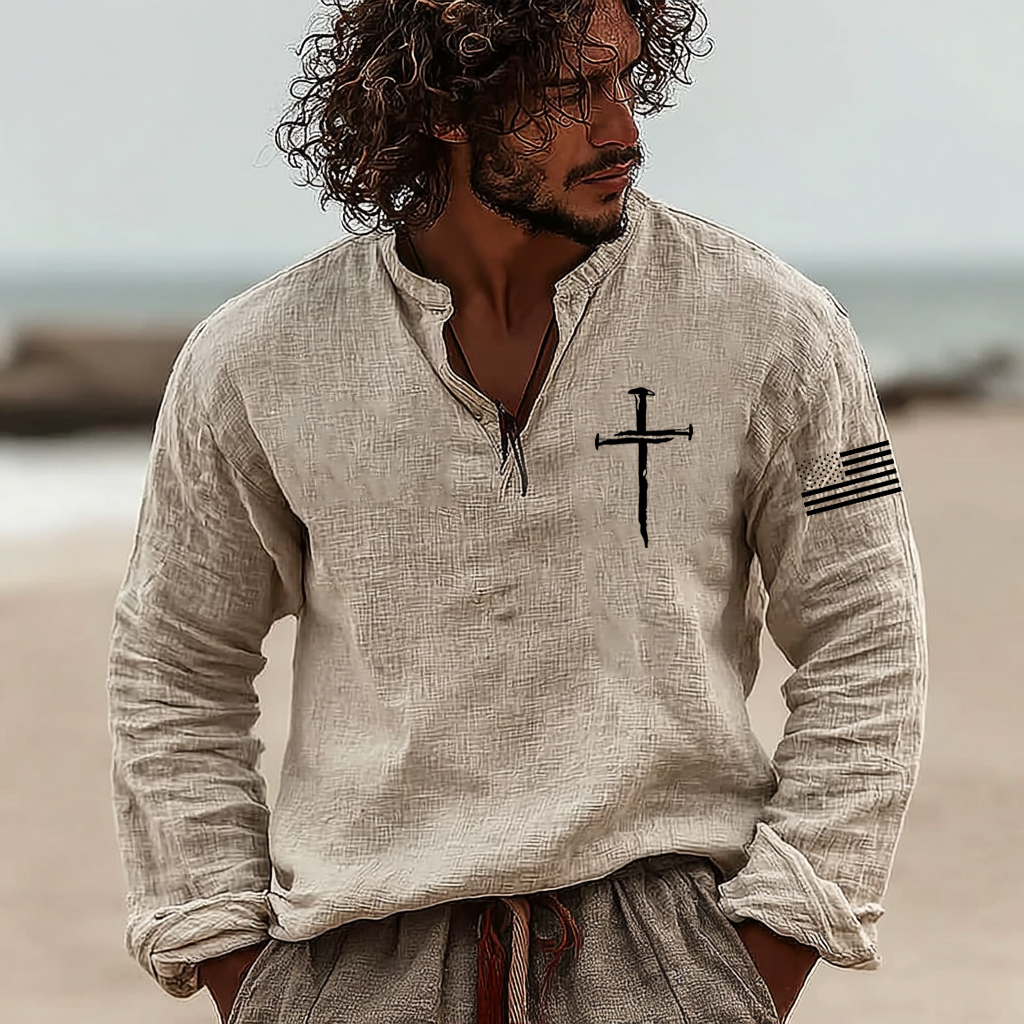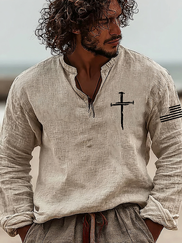 Men's Vintage Faith Cross Art Loose And Comfortable Cotton And Linen Long-sleeved Shirt