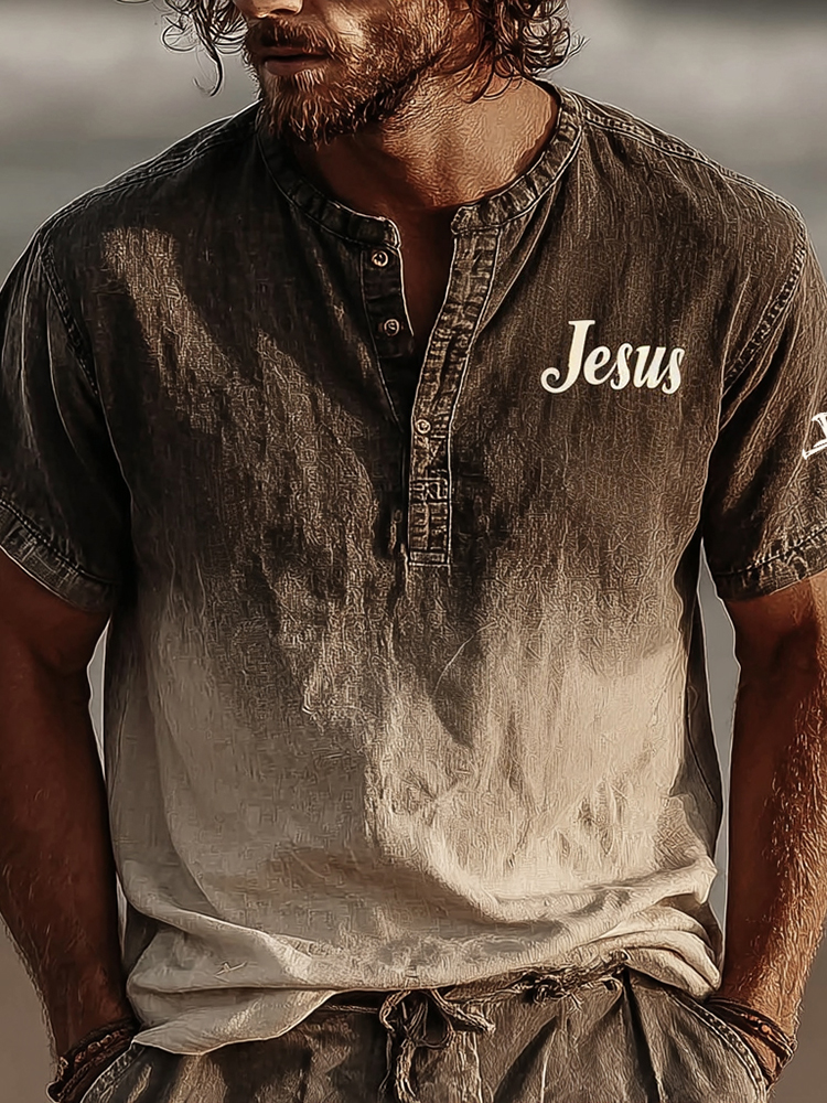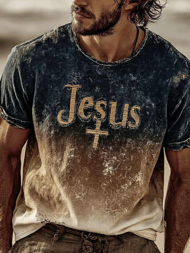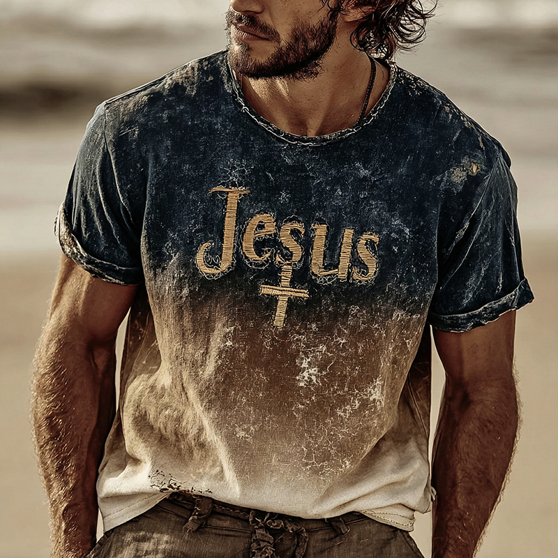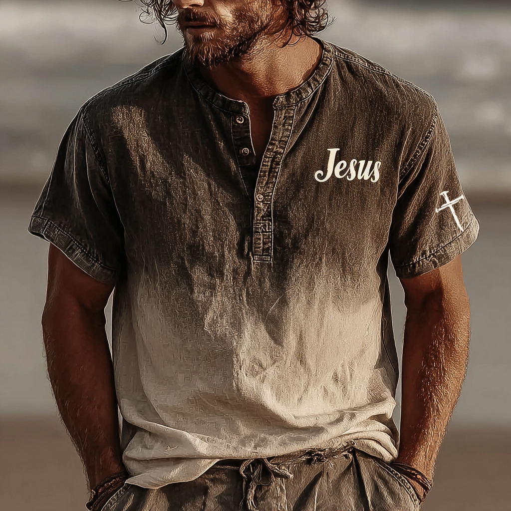 Men's Vintage Faith Cross In Gradient Art Loose And Comfortable Cotton And Linen Short-sleeved Shirt