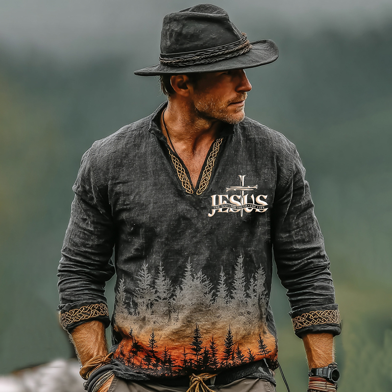 Men's Vintage Jesus Save My Life In Forest Art Loose And Comfortable Cotton And Linen Long-sleeved Shirt