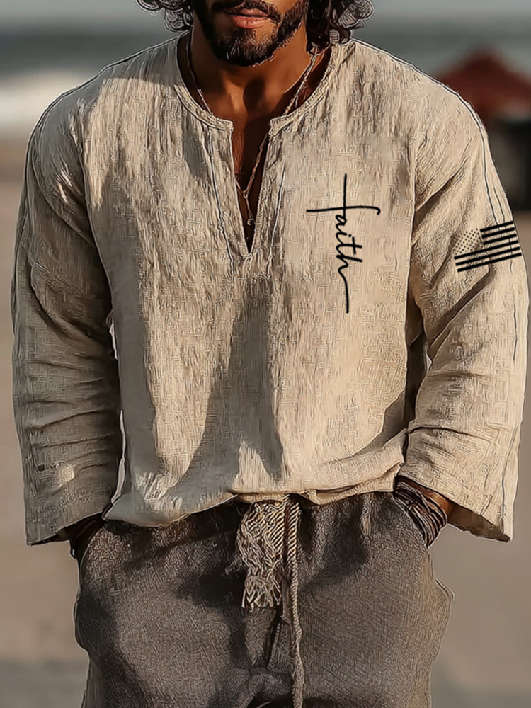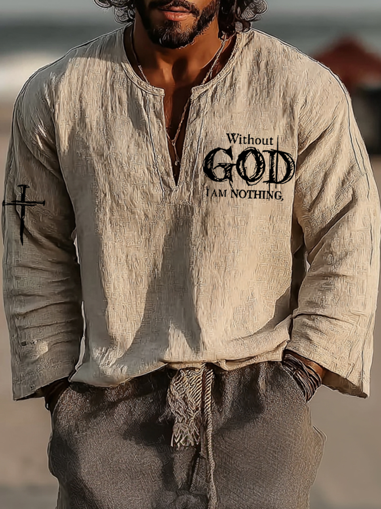 Men's Vintage Faith Without God I Am Nothing Art Loose And Comfortable Cotton And Linen Long-sleeved Shirt