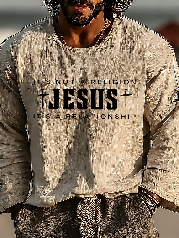 Men's Vintage It's Not A Religion It's A Relationship Art Loose And Comfortable Cotton And Linen Round Neck Shirt