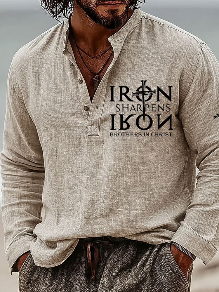 Men's Vintage Iron Sharpen Iron Printed Christian Art Loose And Comfortable Cotton And Linen Long-sleeved Shirt