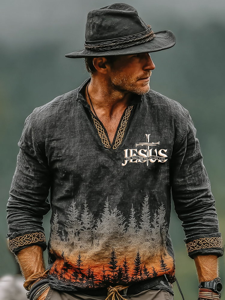Men's Vintage The Way The Truth The Life In Forest Art Loose And Comfortable Cotton And Linen Long-sleeved Shirt