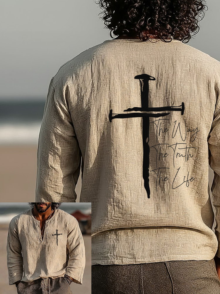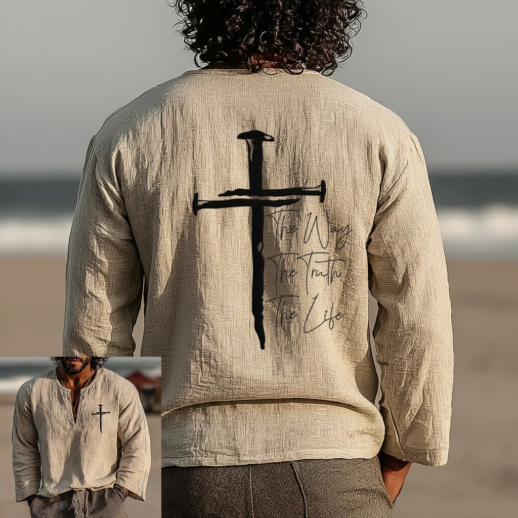 Men's Vintage The Way The Truth The Life Art Loose And Comfortable Cotton And Linen Long-sleeved Shirt