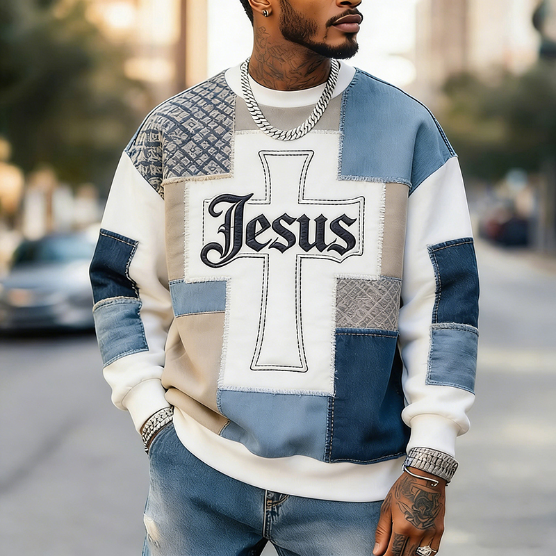 Men's Vintage Cross Faith With Jesus Art Loose And Comfortable Cotton And Linen Round Neck Shirt