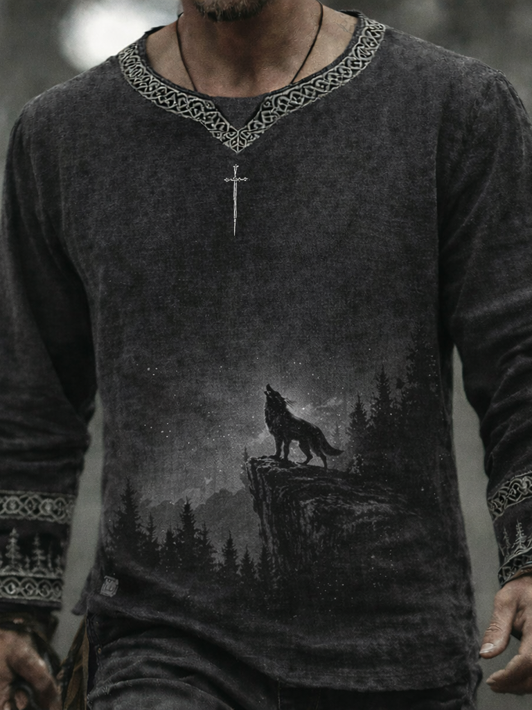 Men's Vintage Cross Faith And Wolf In Forest Art Loose And Comfortable Cotton And Linen Long-sleeved Shirt