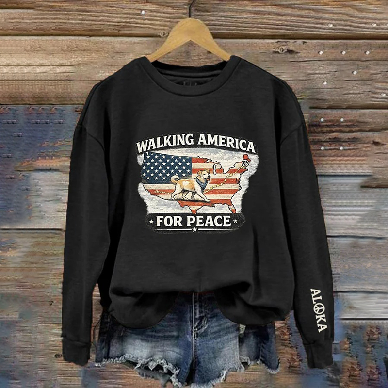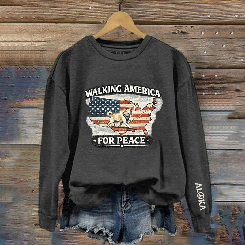 Retro Walking America For Peace With Aloka Dog Print Crew Neck Sweatshirt