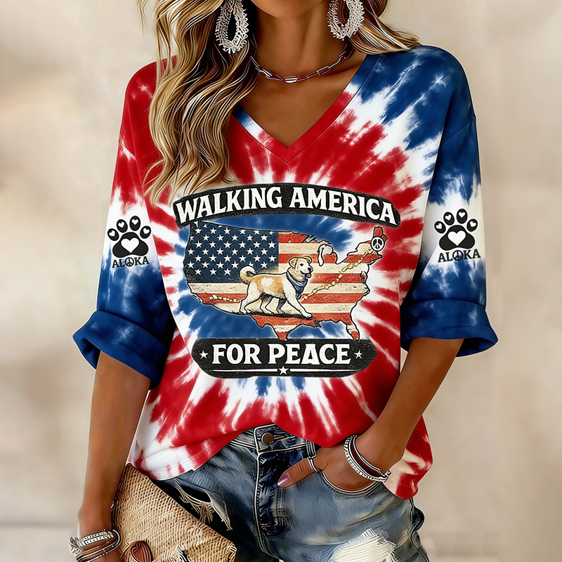 Retro Walking America For Peace With Aloka Dog Tie Dye Print V-neck T-shirt