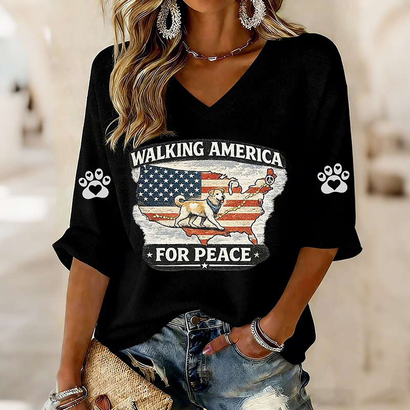 V-neck Retro Walking America For Peace With Aloka Dog Print T-shirt