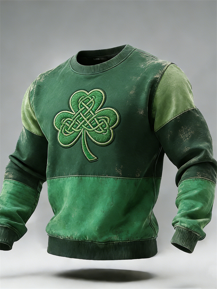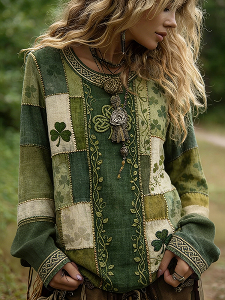 Women's Vintage St Patrick's Day Shamrock Patchwork Art Loose And Comfortable Cotton And Linen Round Neck Shirt