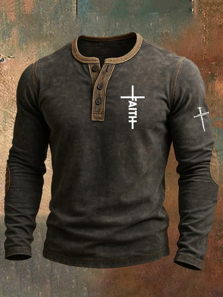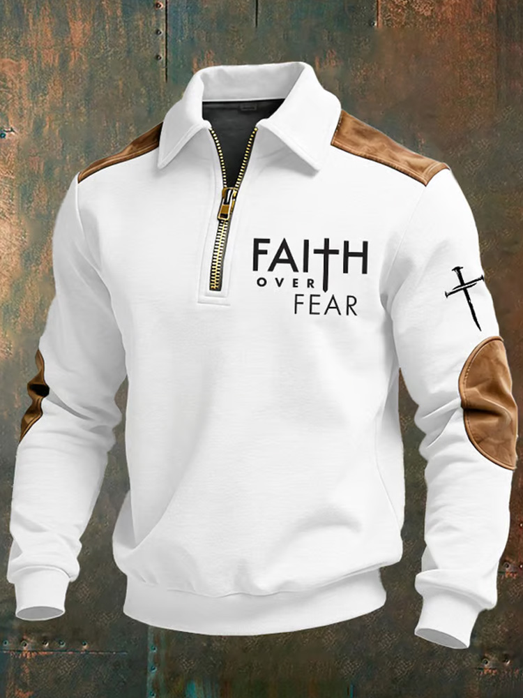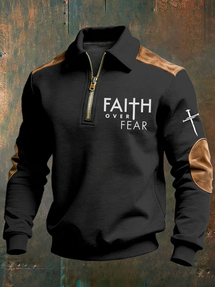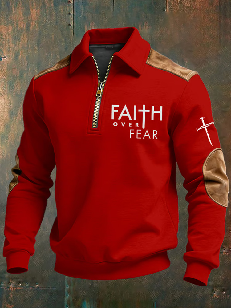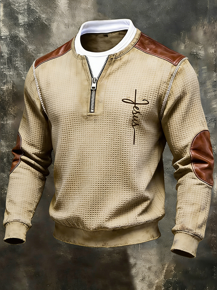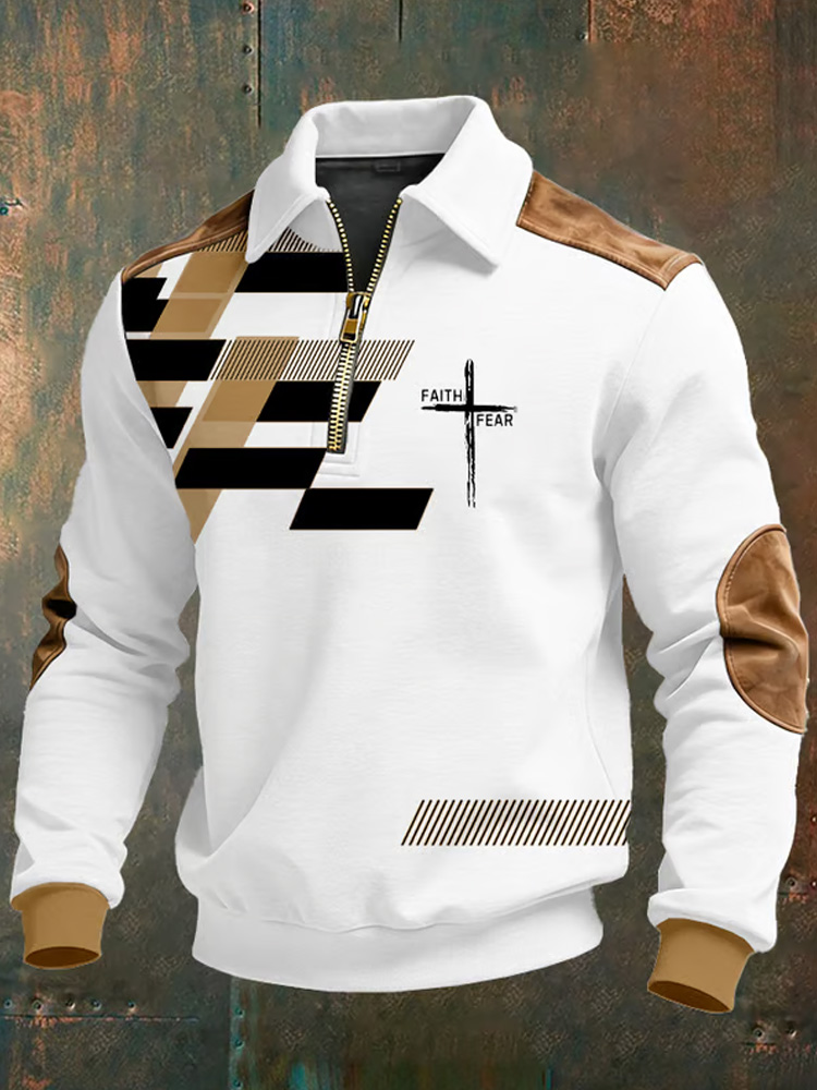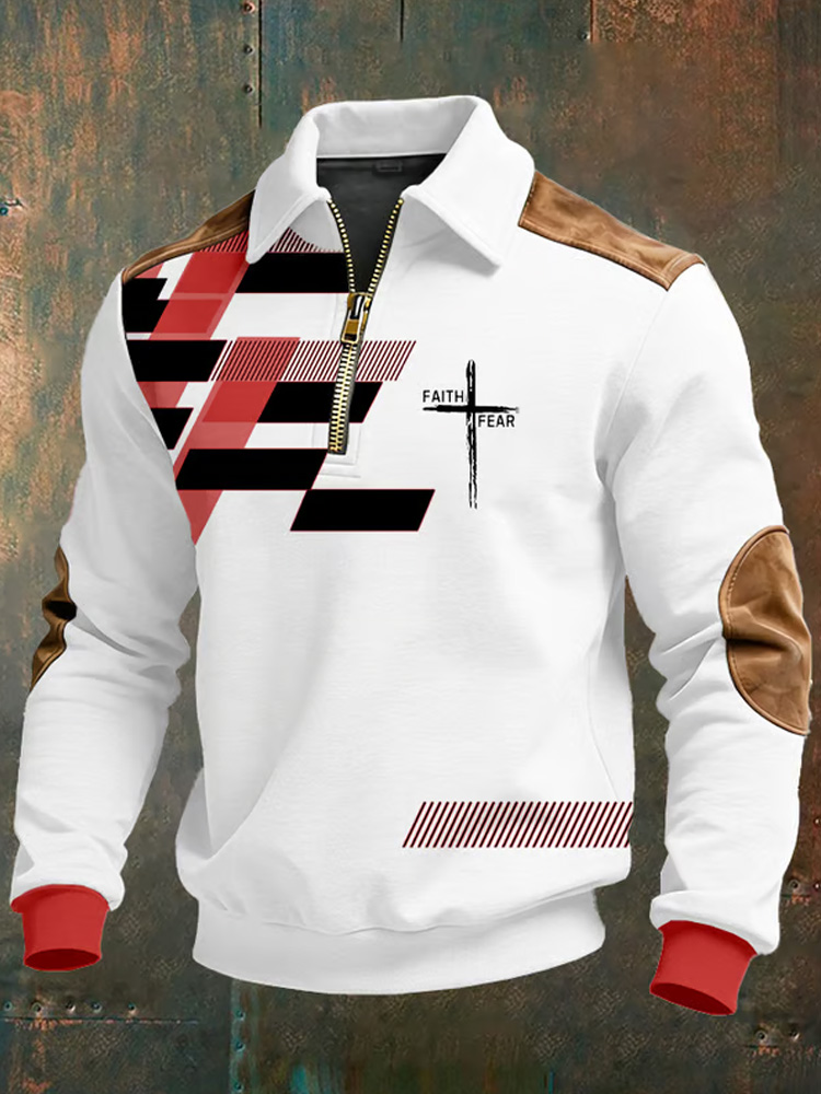 Men's Retro Faux Two-piece Spliced color-block Faith Design Long-sleeved Sweatshirt