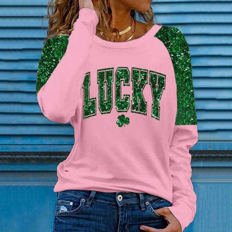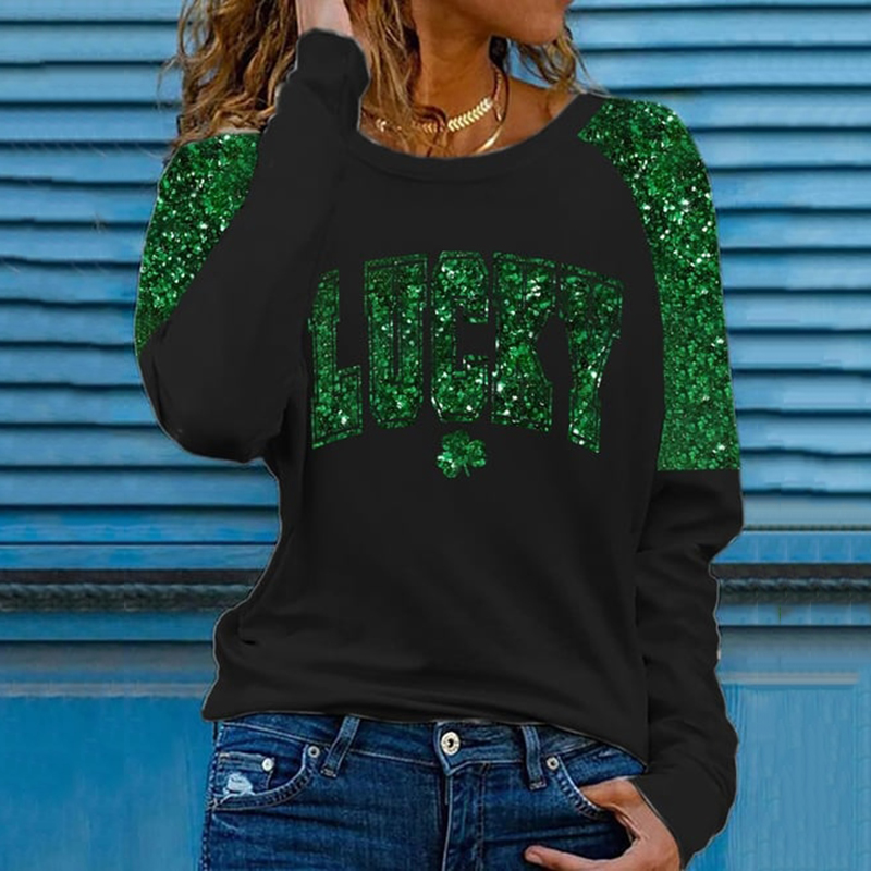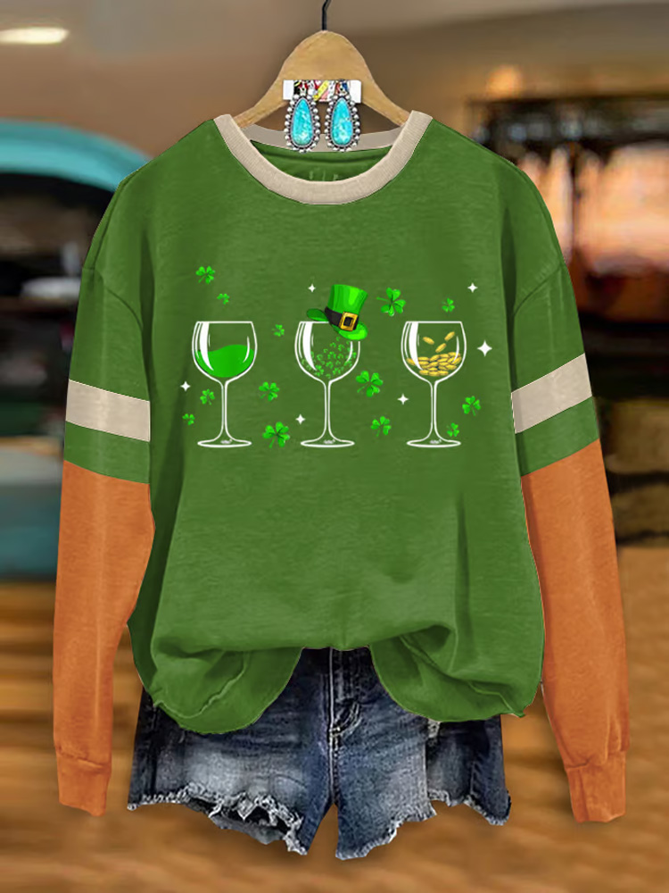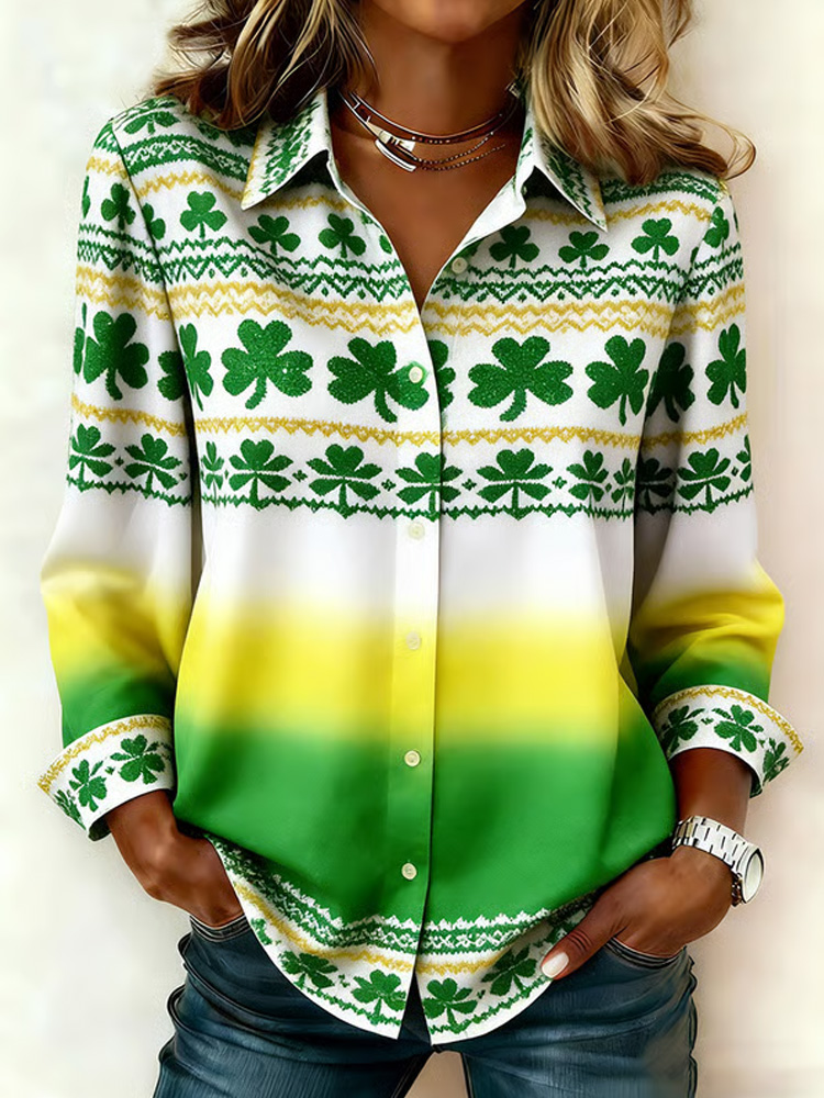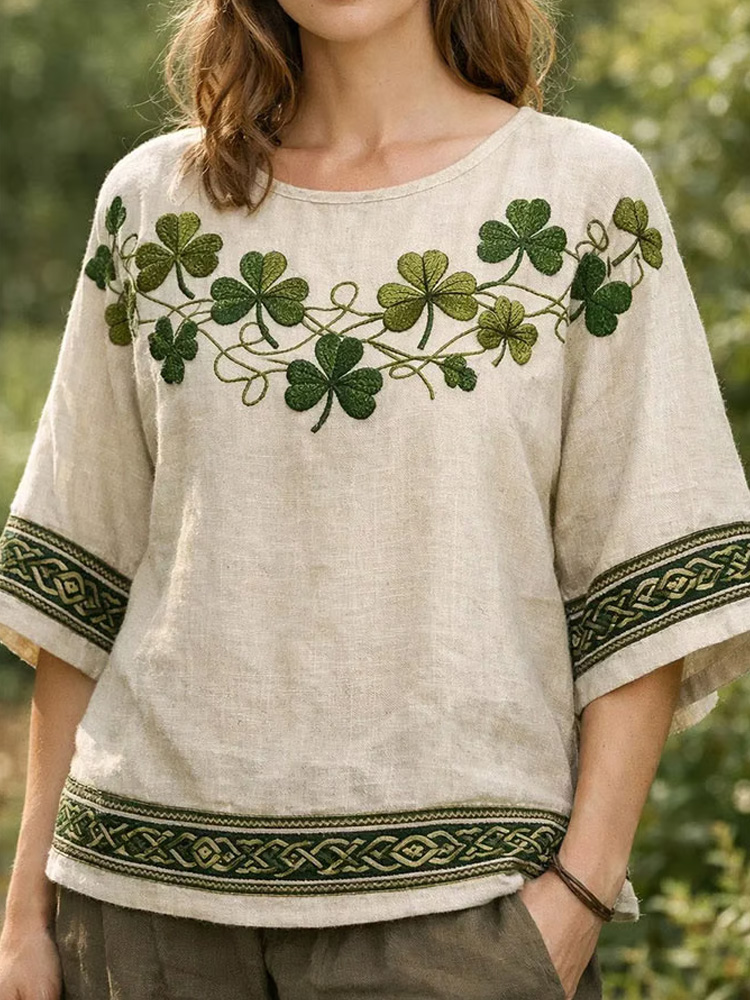 Women's Vintage St Patrick's Day Shamrock Patchwork Art Loose And Comfortable Cotton And Linen V Neck Shirt