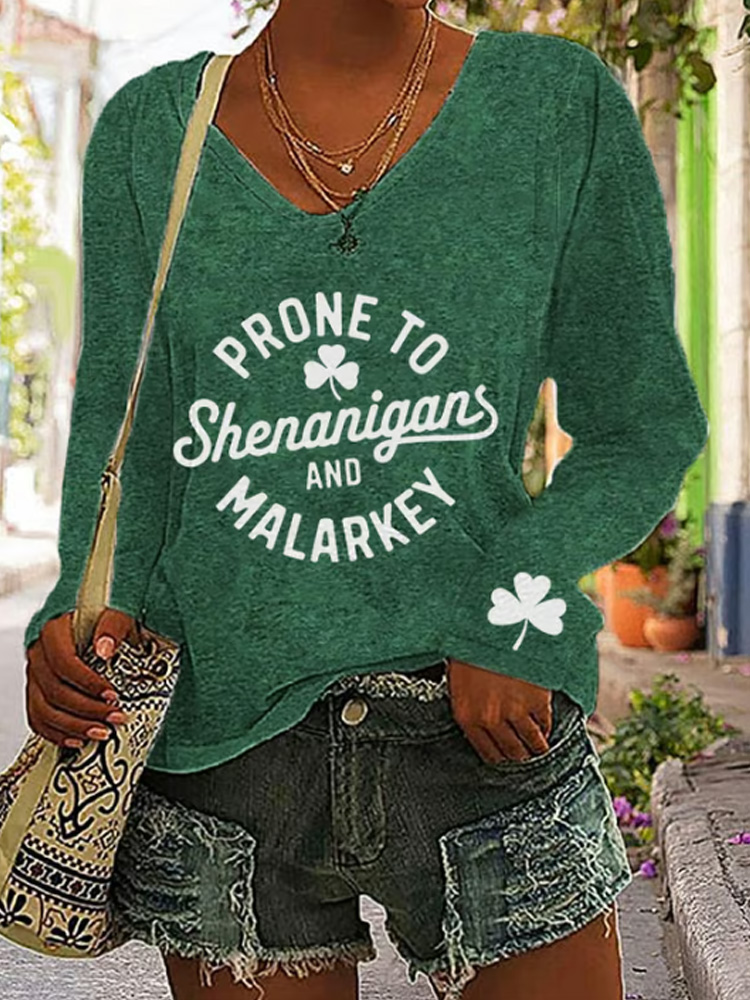 Women's St. Patrick's Day Prone To Shenanigans And Malarkey Print V-neck Long Sleeve T-shirt