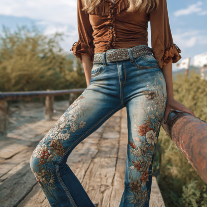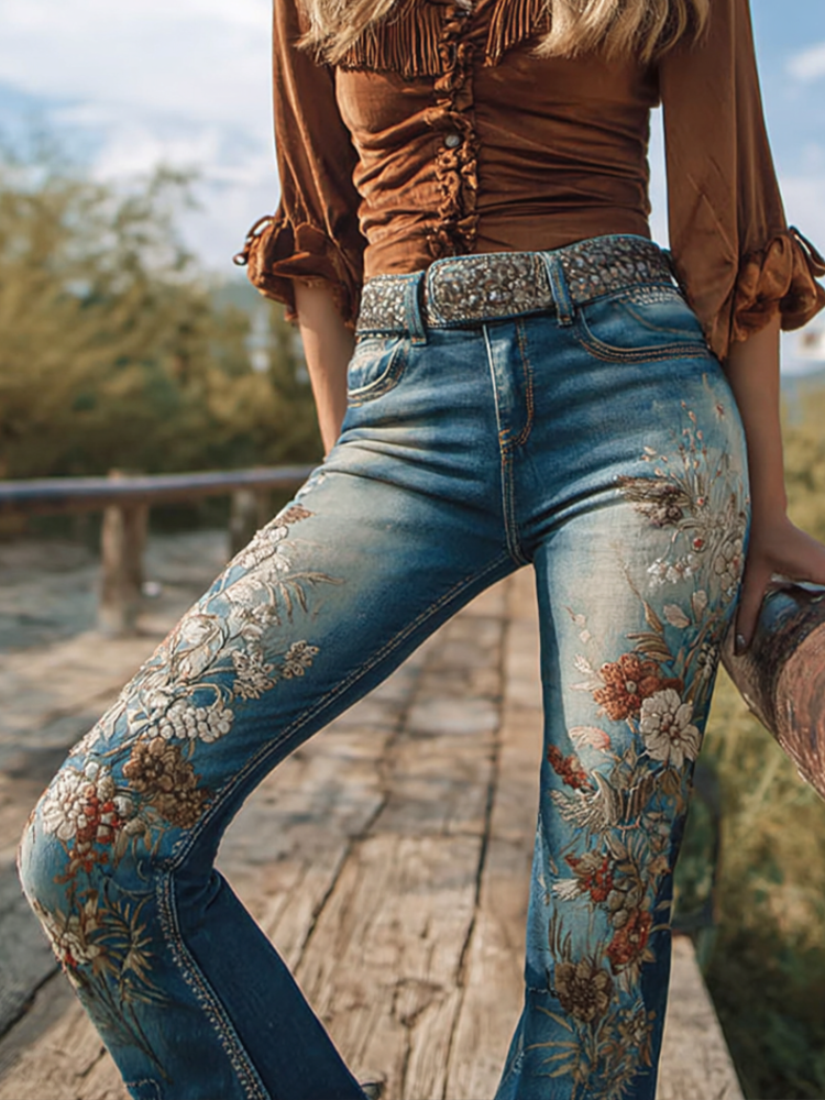 Bohemian Western Cowboy Style Plant Flower Embroidery Women's Skinny Jeans