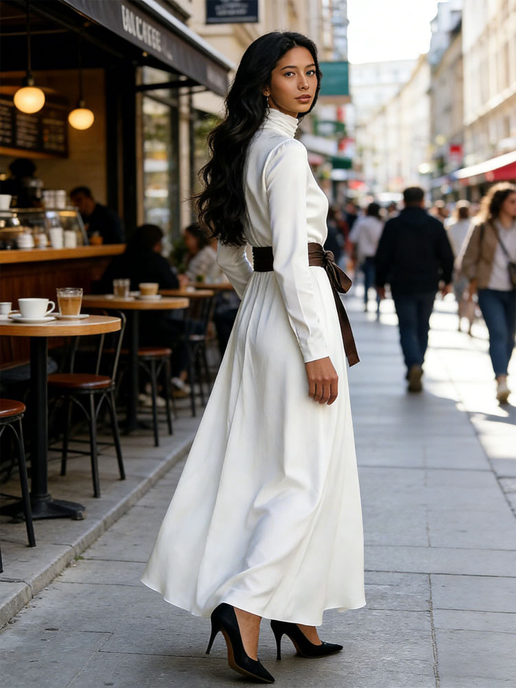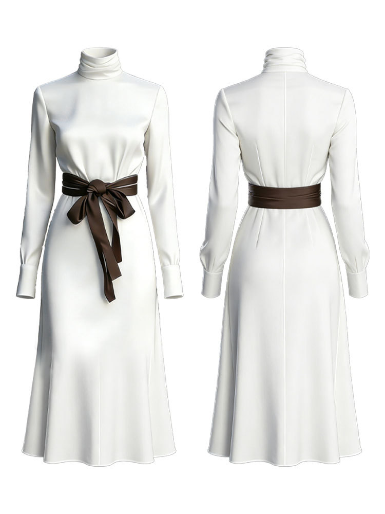 Classy Color Blocked Belted Turtleneck Flowy Maxi Dress