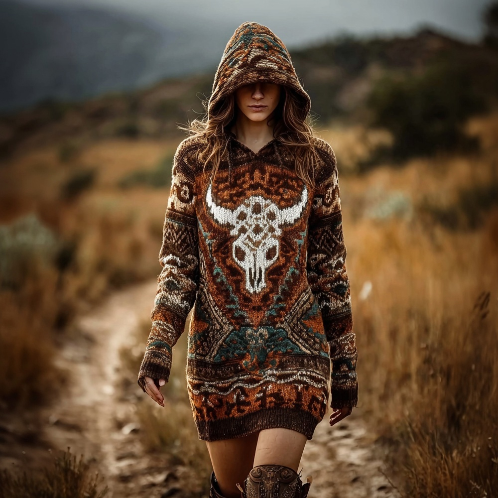 Classy Retro Western Aztec Pattern Cozy Hooded Sweater Dress