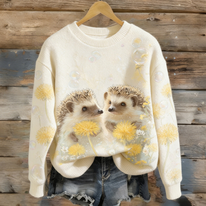 Cute Hedgehog And Dandelion Pattern Comfortable Crew Neck Sweater For Women