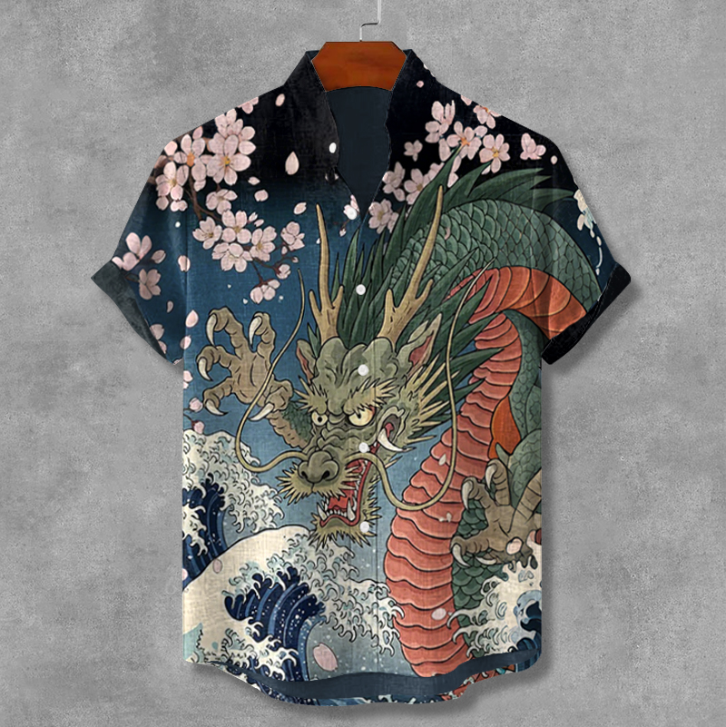 Japanese Cherry Blossoms With Dragon In Huge Waves Art Short Sleeve Shirt