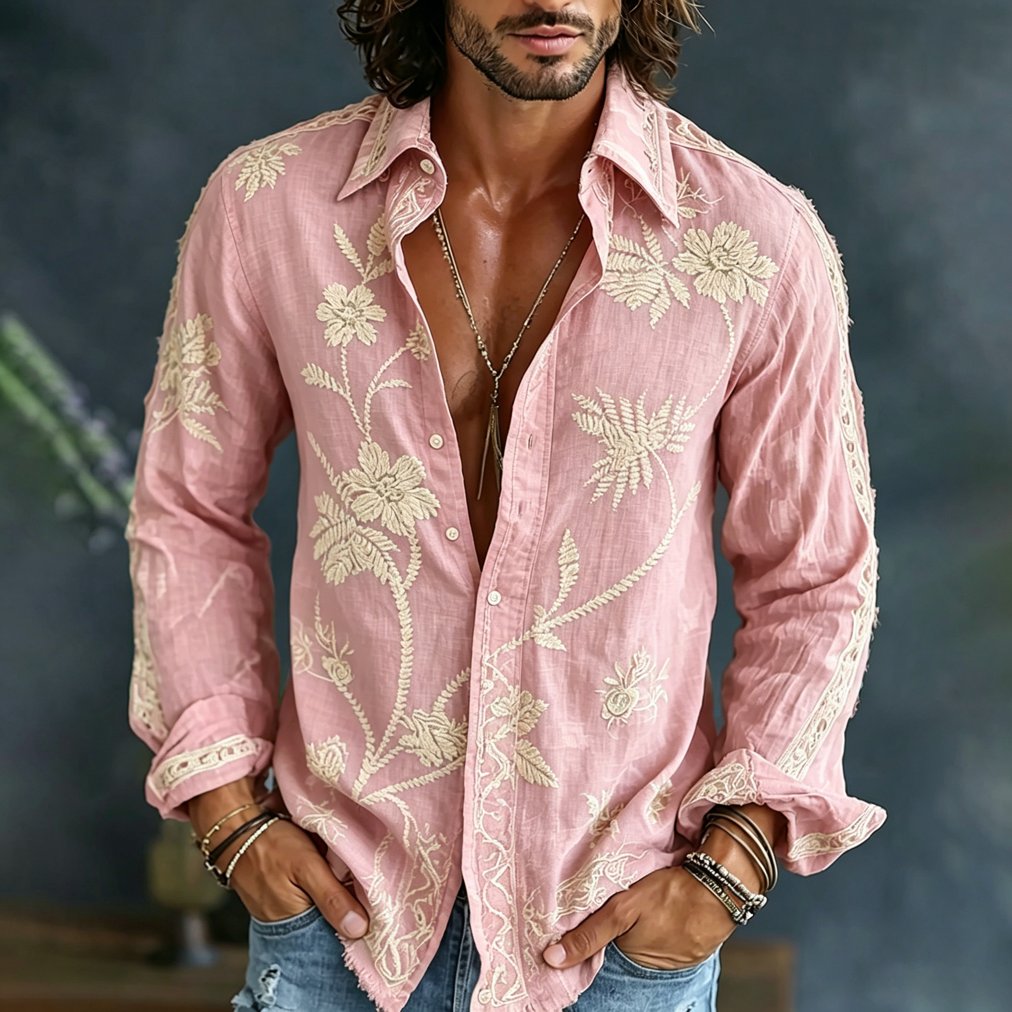 Men's Spring Floral Embroidered Art Print Flowy Linen Blend Casual Shirt
